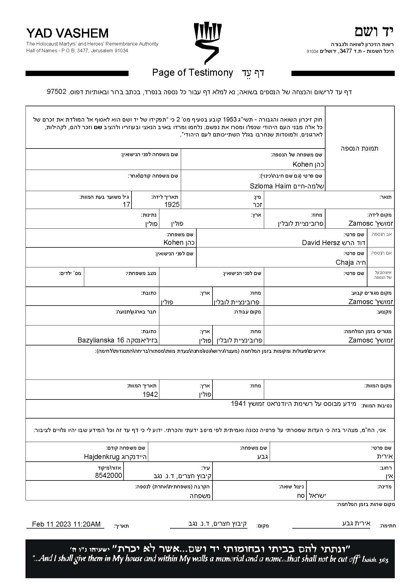 Kohen Szloma Haim 1925 Zamosc, Pologne Feuille de témoignage (digitale)