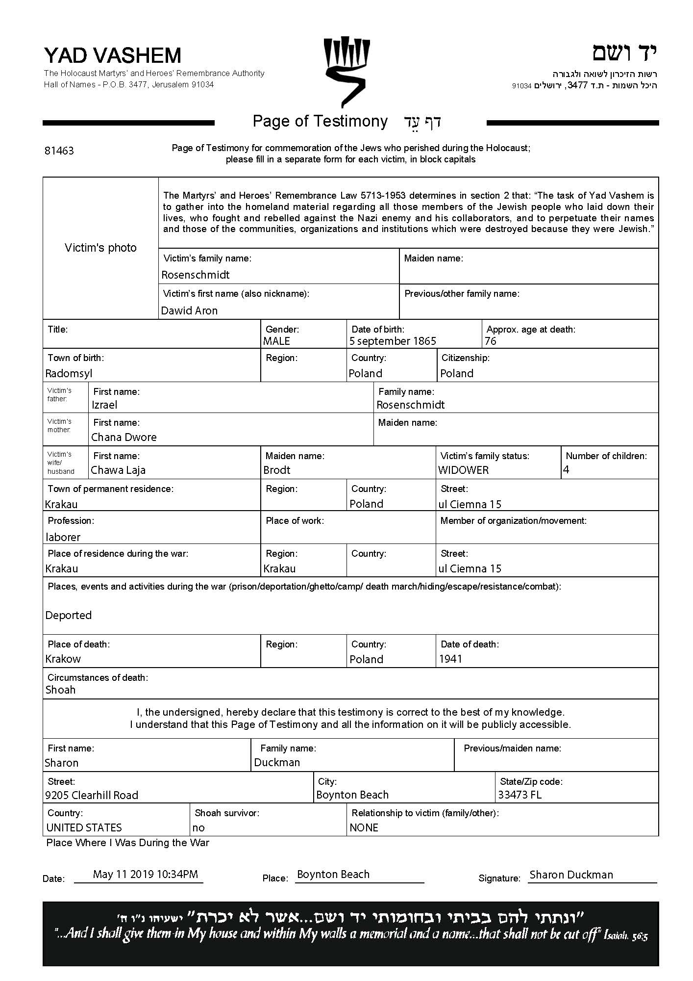 Dawid Aron a été assassiné pendant la Shoah. Lieu de la mort: Krakau, Pologne en 1941.