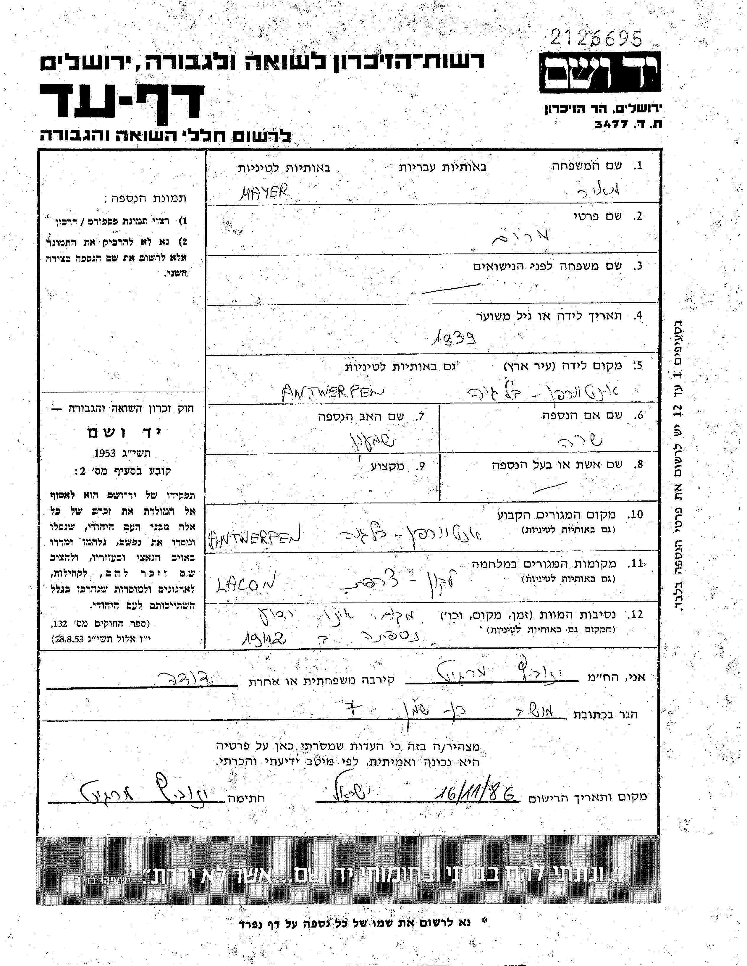 Mayer | Miriam | 1939 | Antwerpen, Belgique | Feuille de témoignage |