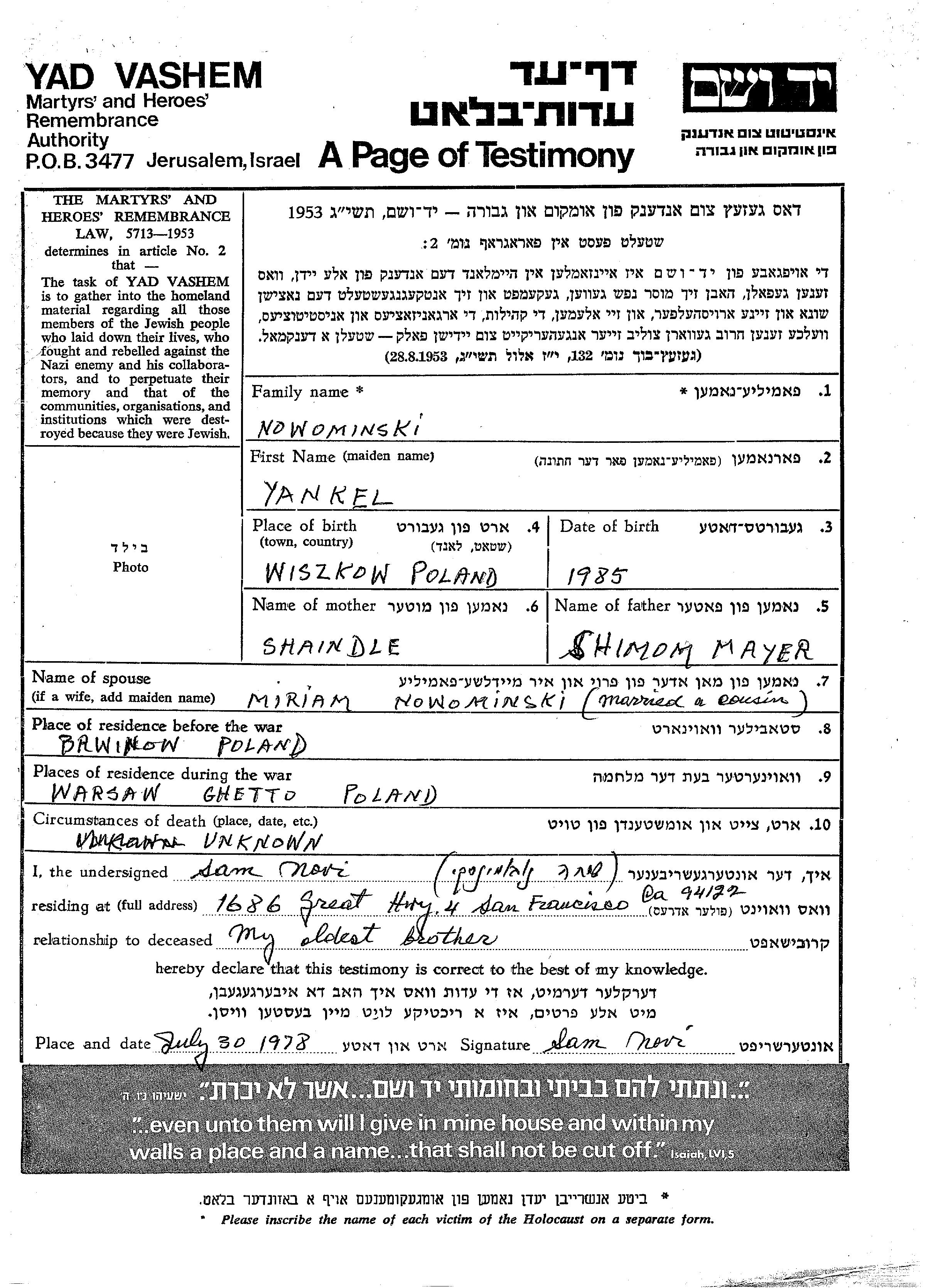 Yankel Nowominski est né à Wiszkow, Pologne en 1895, fils de Shimon Mayer et de Shaindle. Il était Mariée à Miriam. Avant la seconde guerre mondiale il vivait à Brwinow, Pologne. Au cours de la guerre, il était à Warsaw, Pologne.