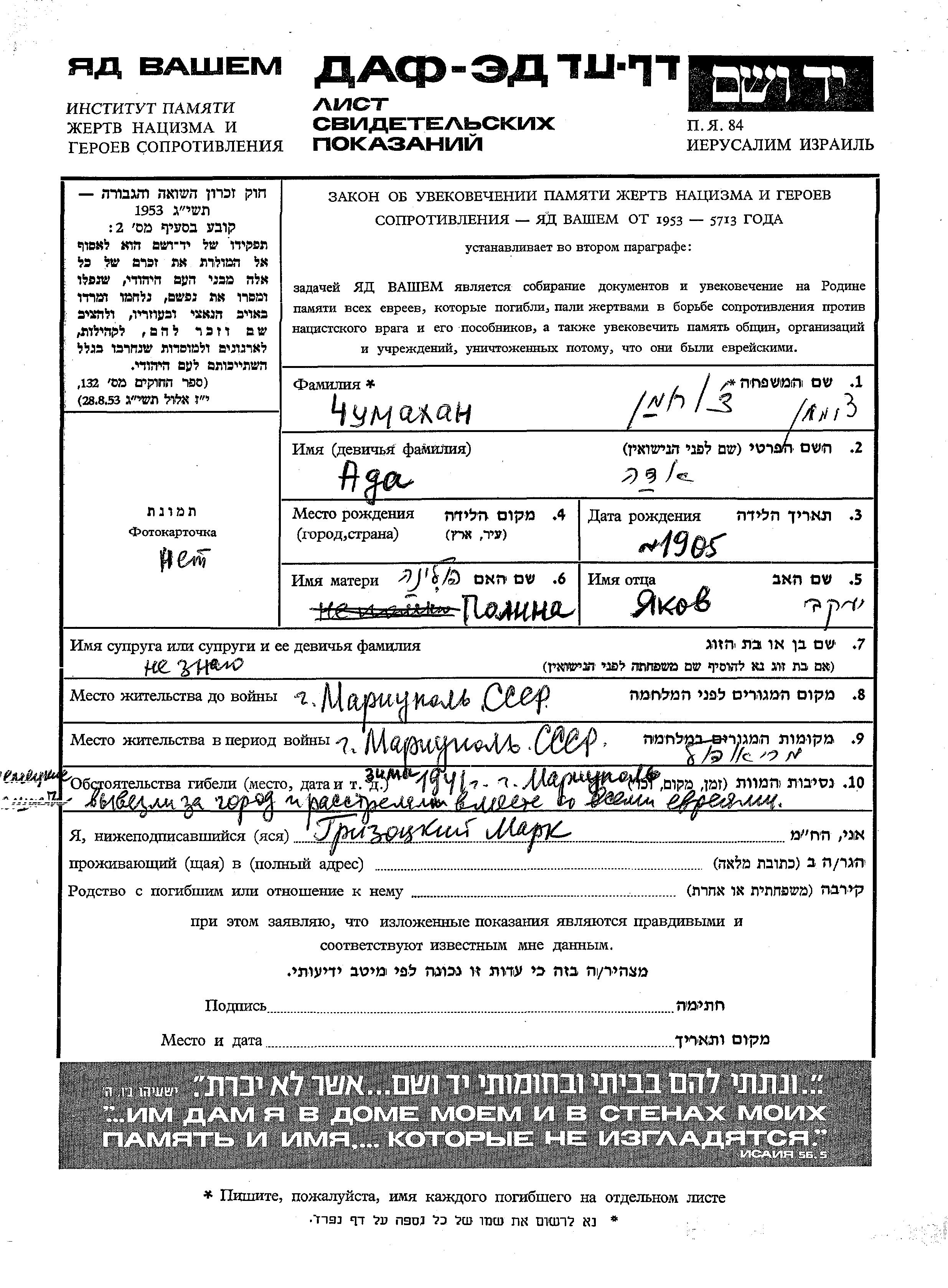 Chumakhan Ede Ada 1905 Mariupol, Ukraine (URSS) Feuille de témoignage