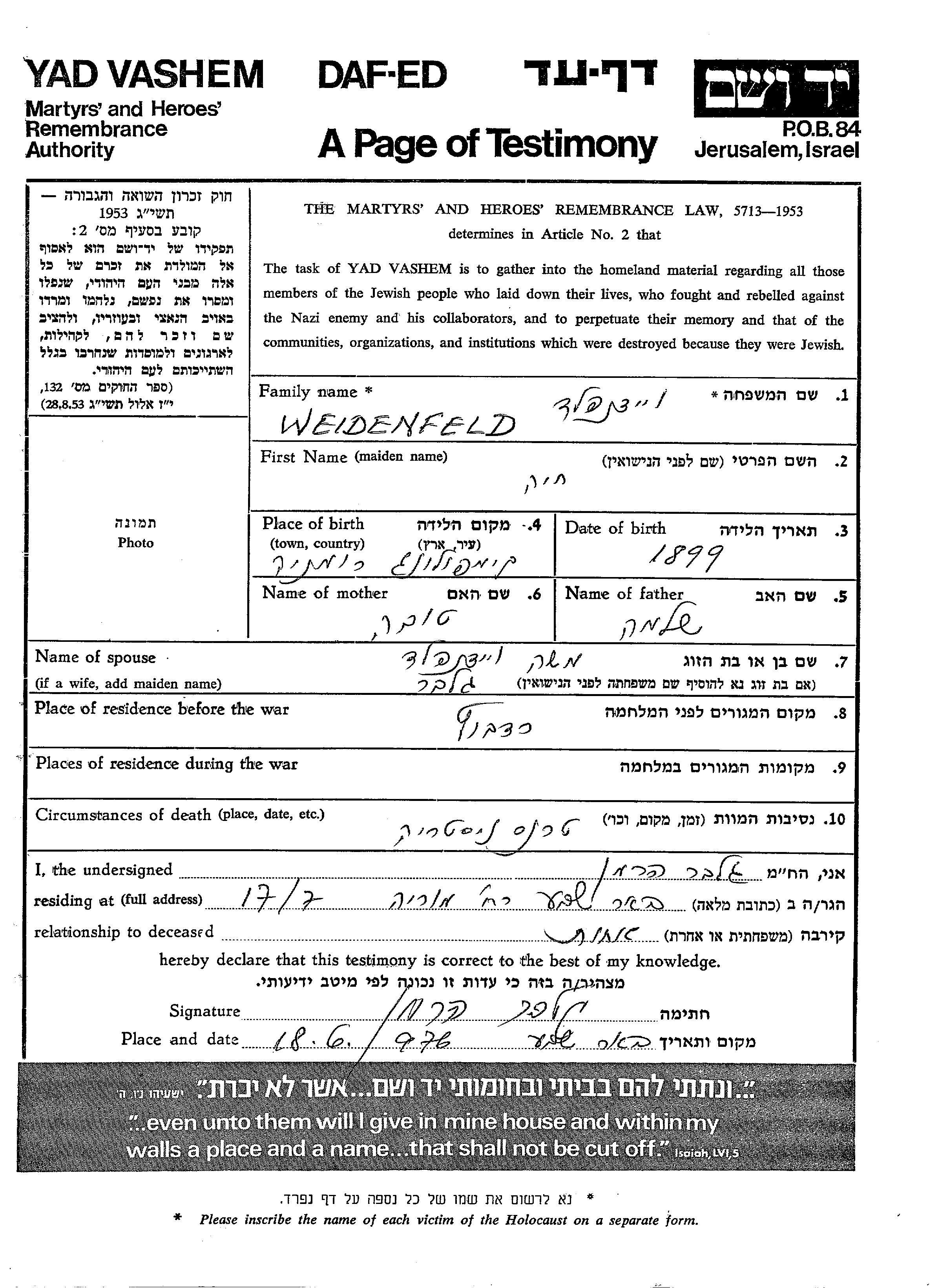 Weidenfeld Khaia 1899 endroit inconnu, Feuille de témoignage