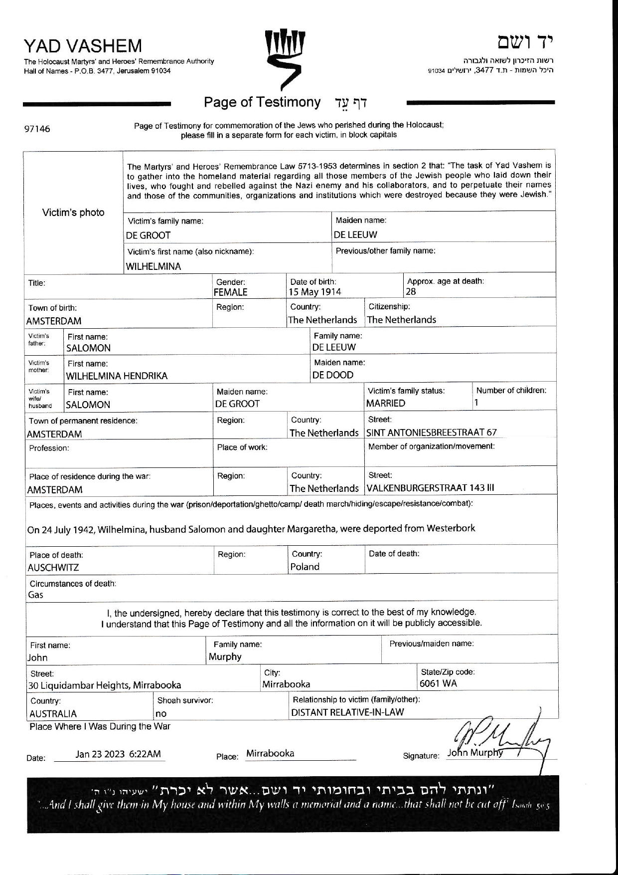 On 24 July 1942, Wilhelmina, husband Salomon and daughter Margaretha, were deported from Westerbork