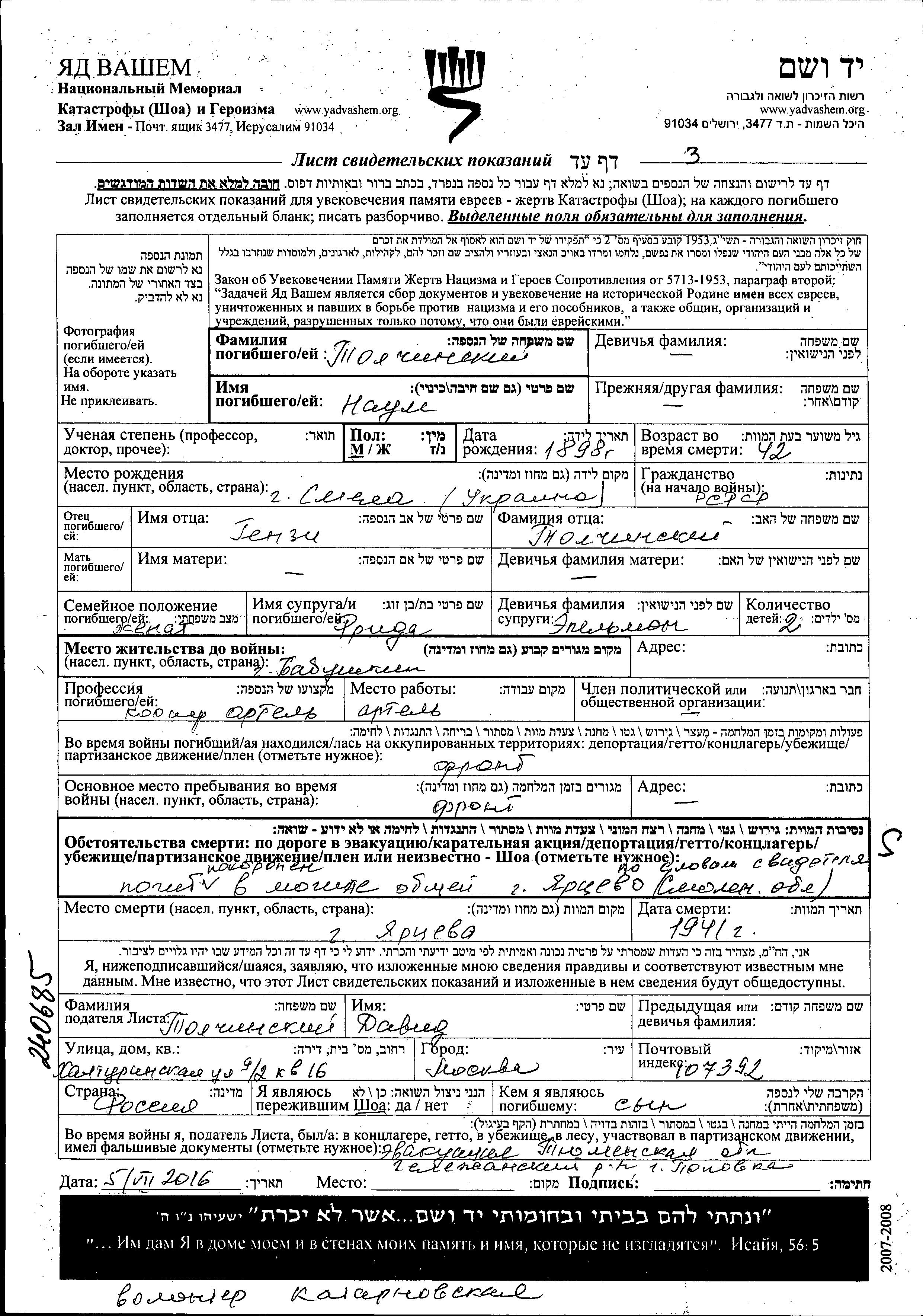 Yad Vashem - Pages of Testimony Names Memorial Collection