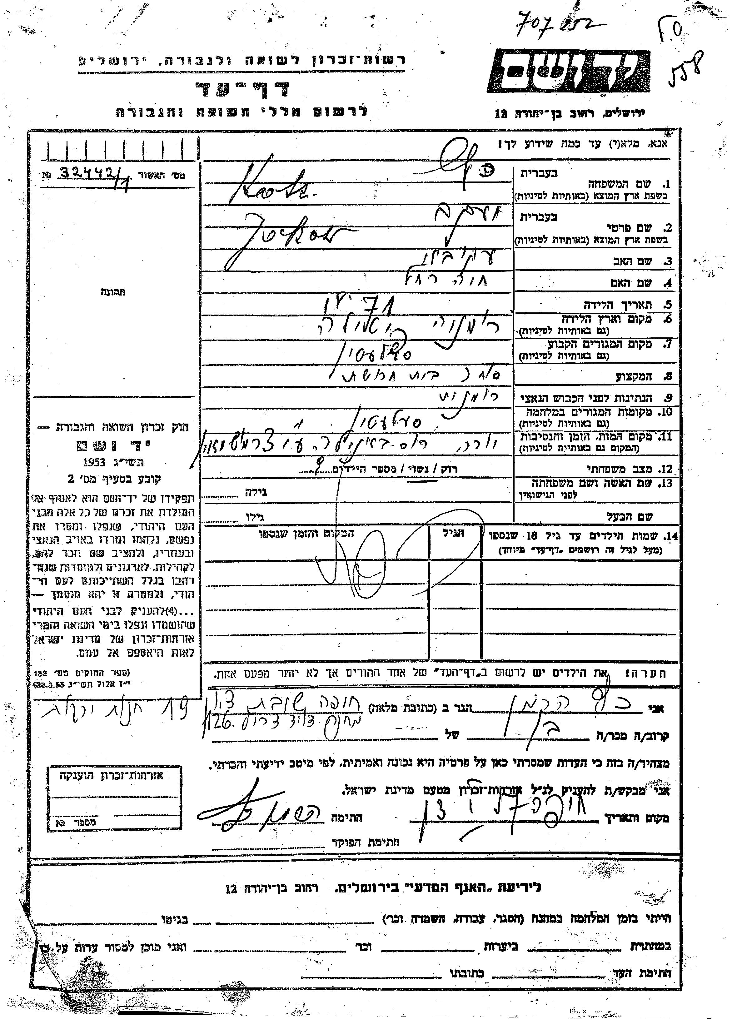 Yad Vashem - Pages of Testimony Names Memorial Collection