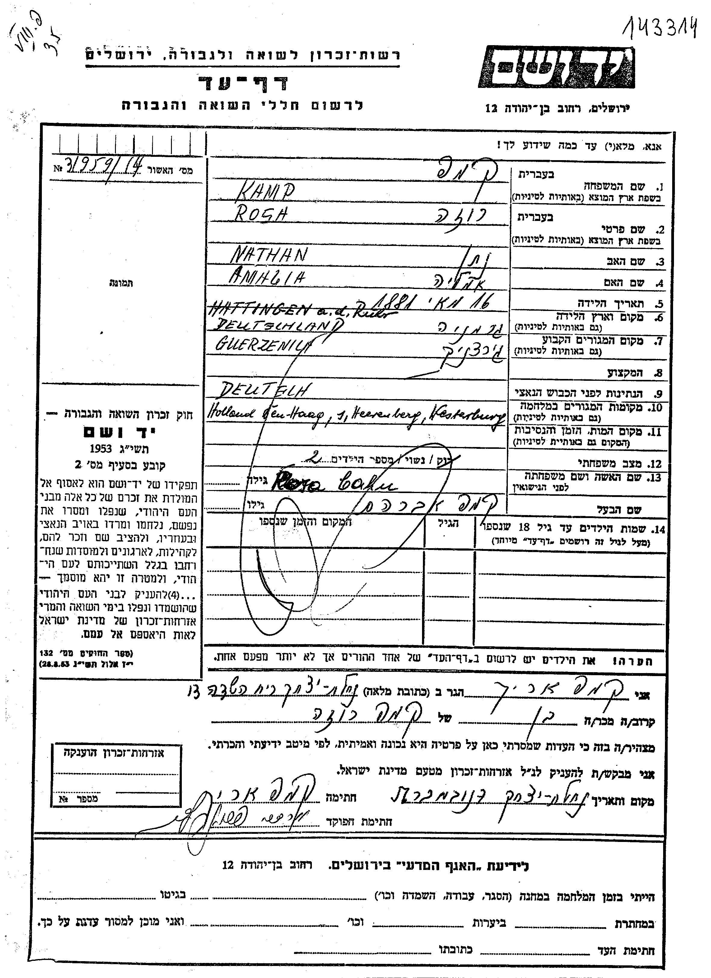 Roza Kamp née Cahn est née à Hattingen, Allemagne en 1881, fille de Nathan et de Amalia. Elle était Mariée à Avraham. Avant la seconde guerre mondiale elle vivait à Guerzenich, Allemagne. Pendant la guerre, elle était à Den Haag, Pays-Bas.