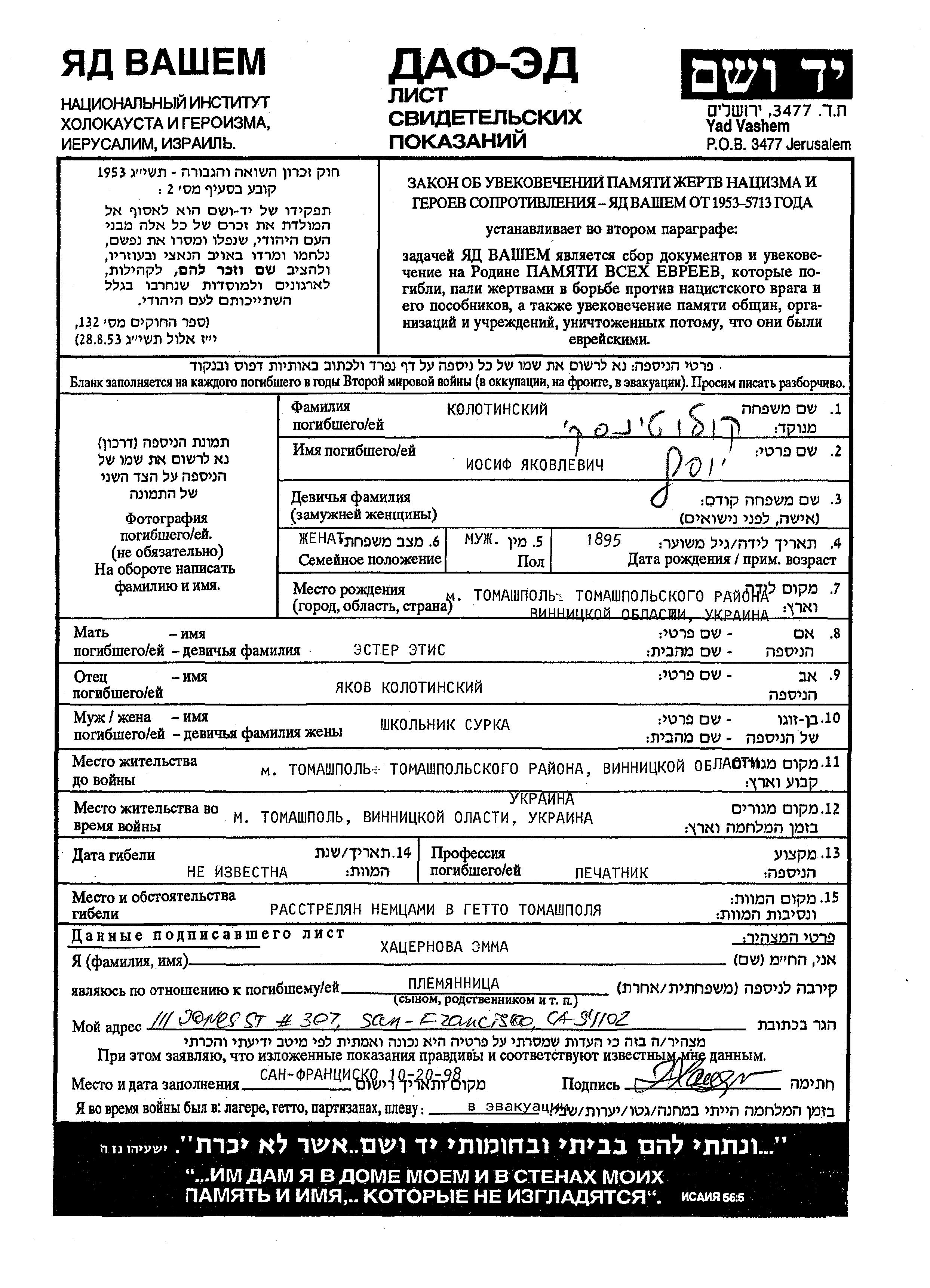 Kolotinski Iosif 1895 Tomashpol, Ukraine (URSS) Feuille de témoignage