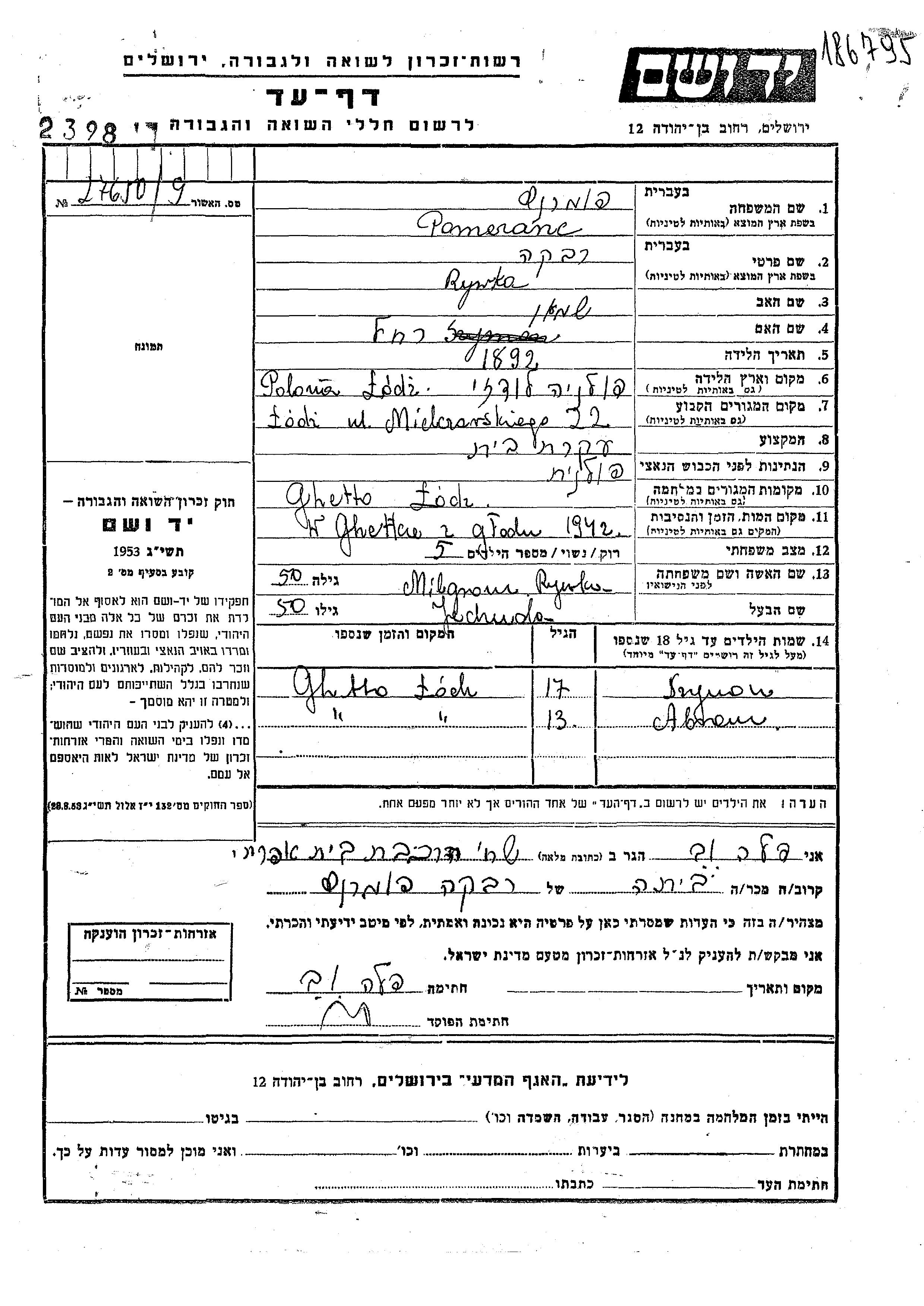 Pomeranc Rywka 1892 Lodz, Pologne Feuille de témoignage
