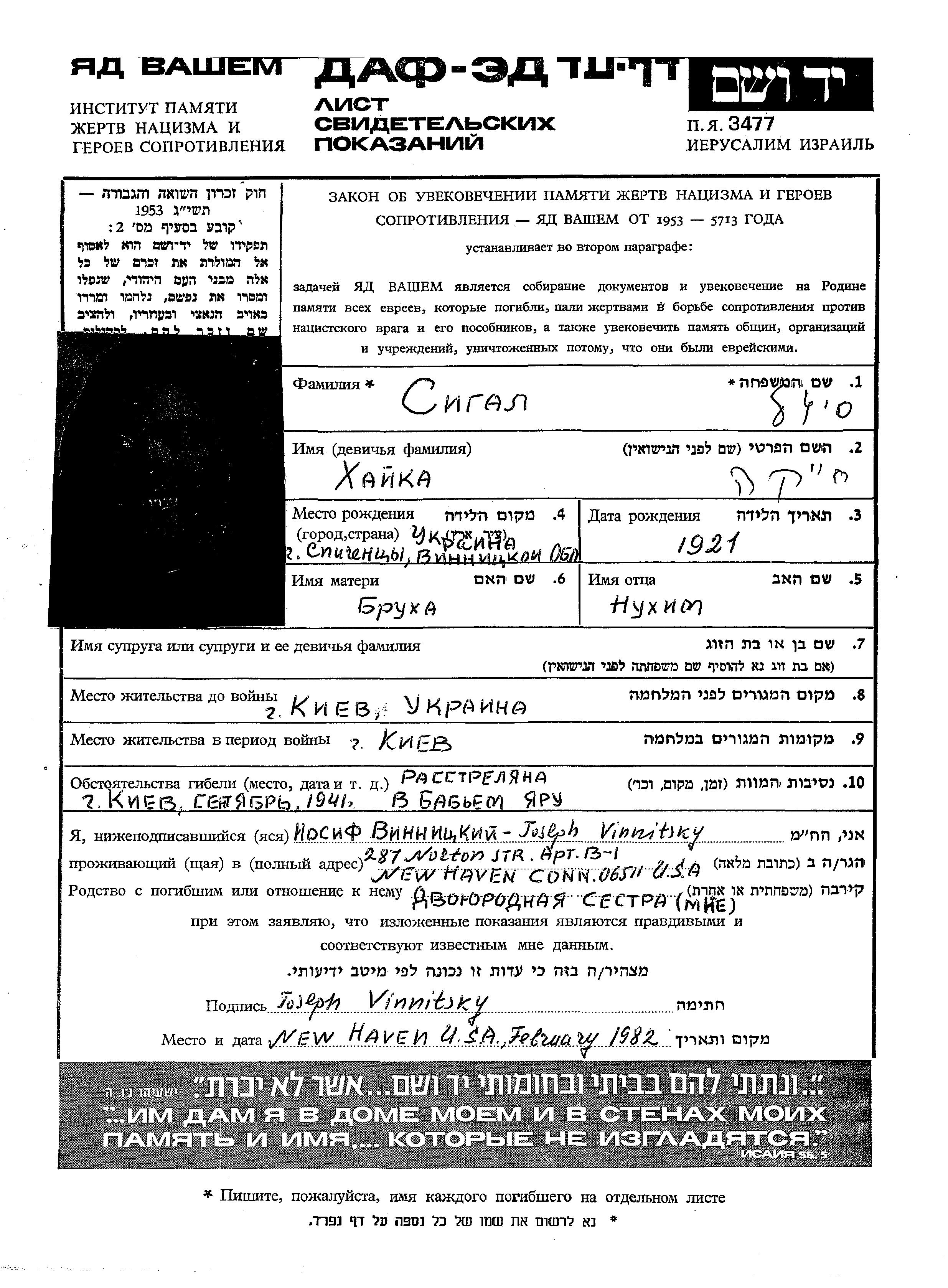 Sigal Khaika 1921 Kiev, Ukraine (URSS) Feuille de témoignage