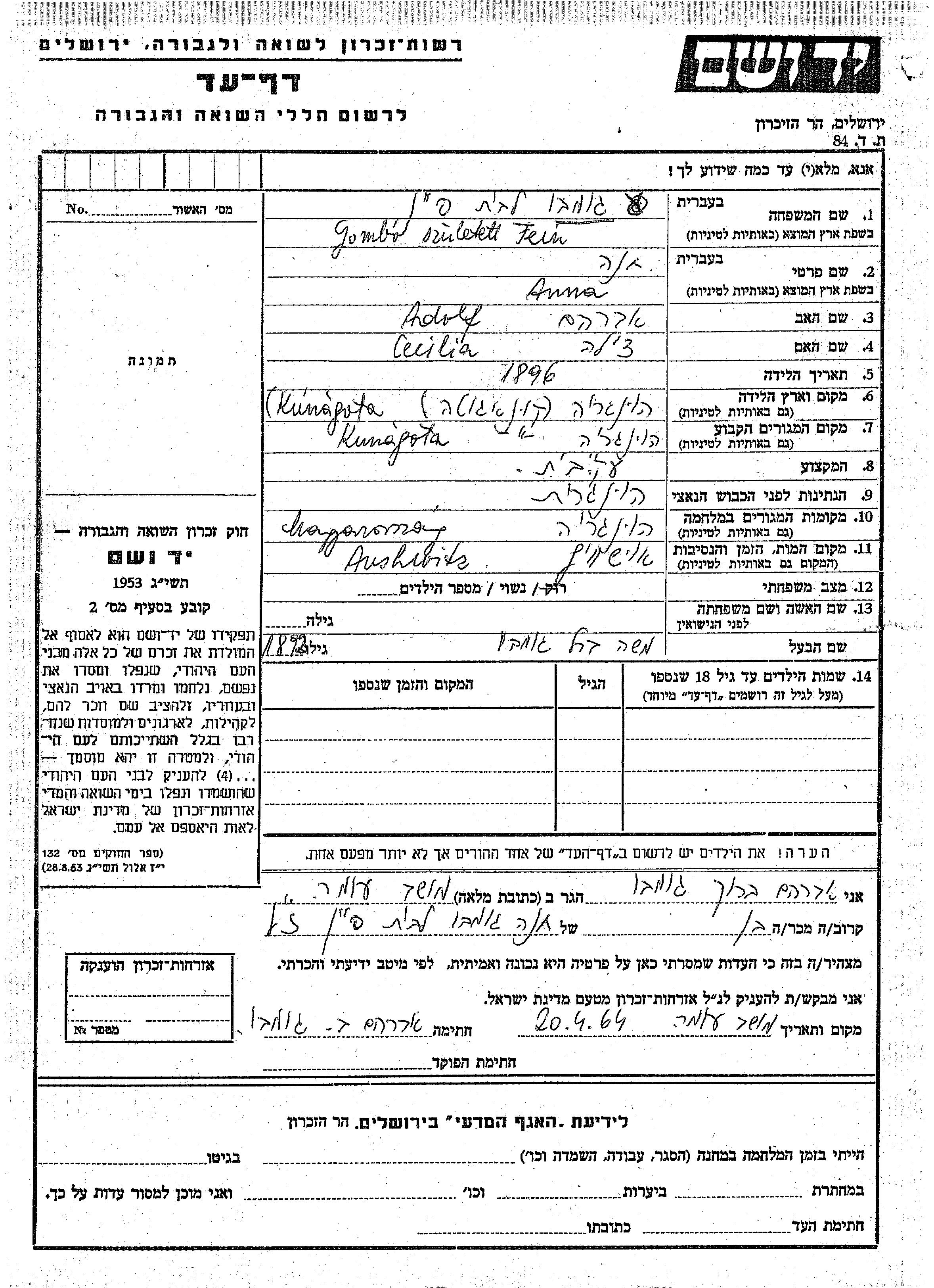 Anna Gombo née Fein est née à Kunagota, Hongrie en 1896, fille de Adolf Avraham et de Cecilia Tzila. Elle était Femme au foyer et Mariée à Moshe. Avant la seconde guerre mondiale elle vivait à Kunagota, Hongrie. Pendant la guerre, elle était à Hongrie.