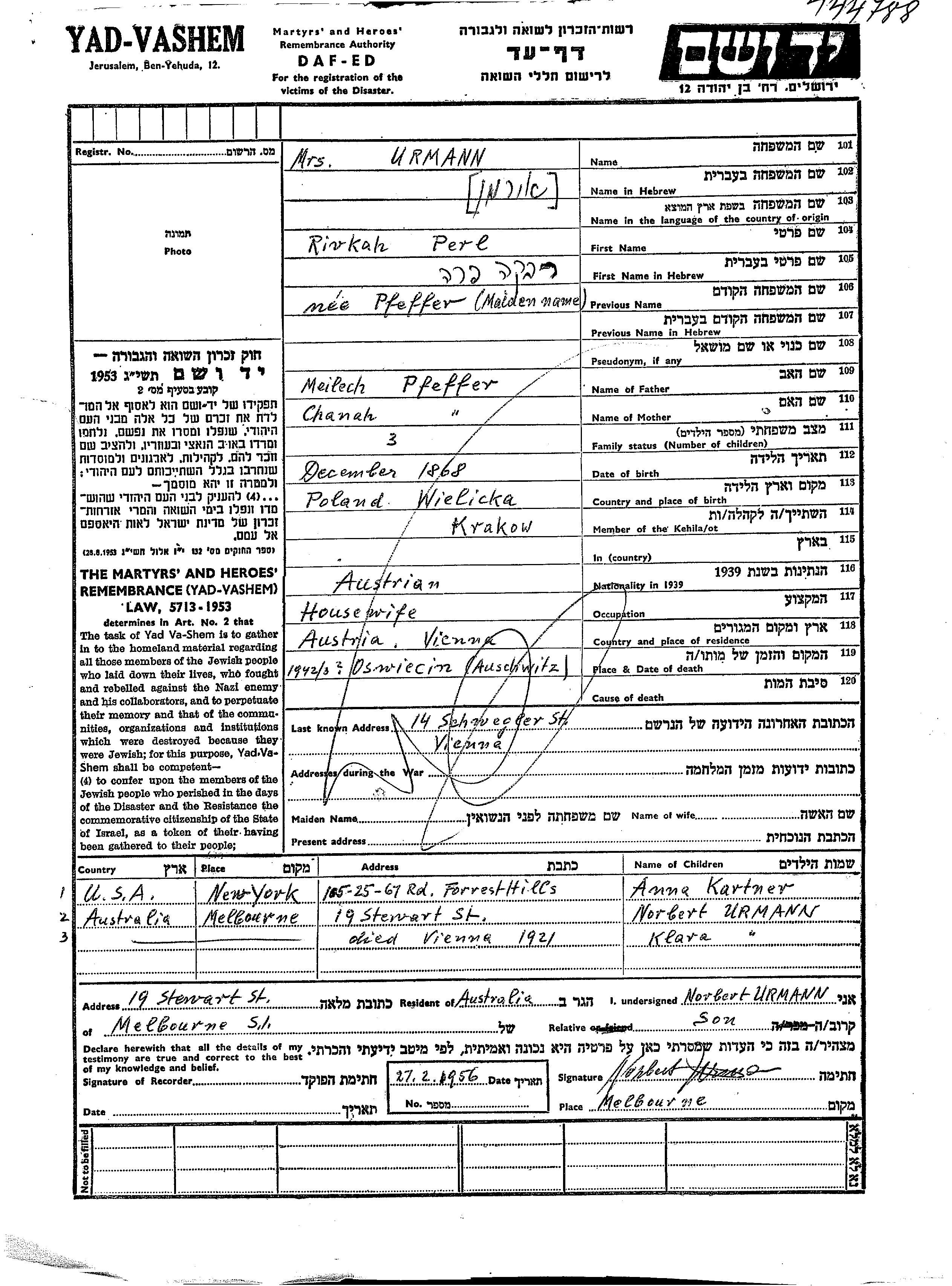 Rivkah Pere Urmann née Pfeffer est née à Wieliczka, Pologne en 1868, fille de Meilech et de Chanah. Elle était Femme au foyer et Mariée. Avant la seconde guerre mondiale elle vivait à Vienna, Autriche.