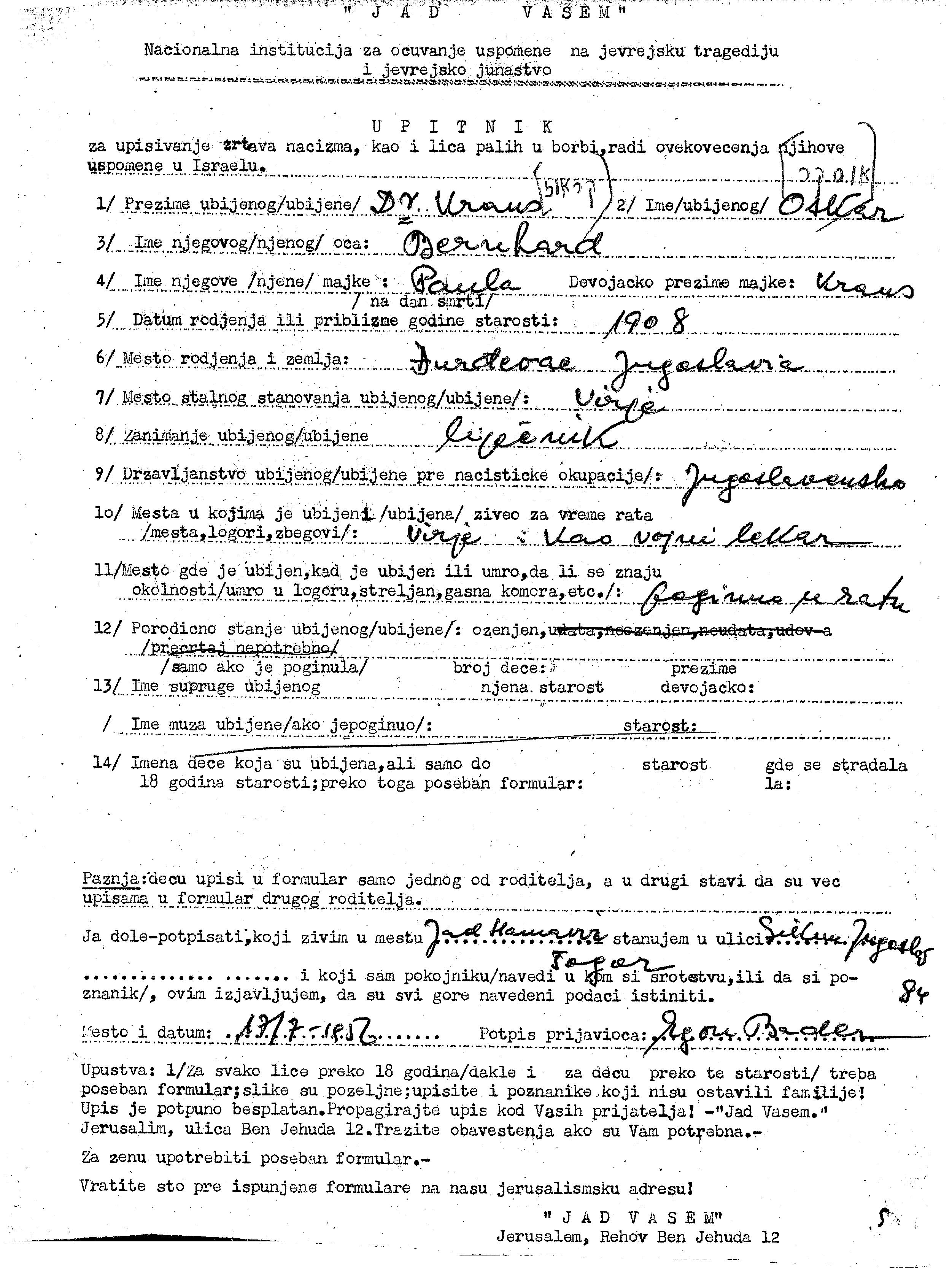 Dr. Oskar Kraus est né à Durdevac, Yugoslavie en 1908, fils de Bernhard et de Paula. Il était Médecin et Marié. Avant la seconde guerre mondiale il vivait à Virje, Yugoslavie.