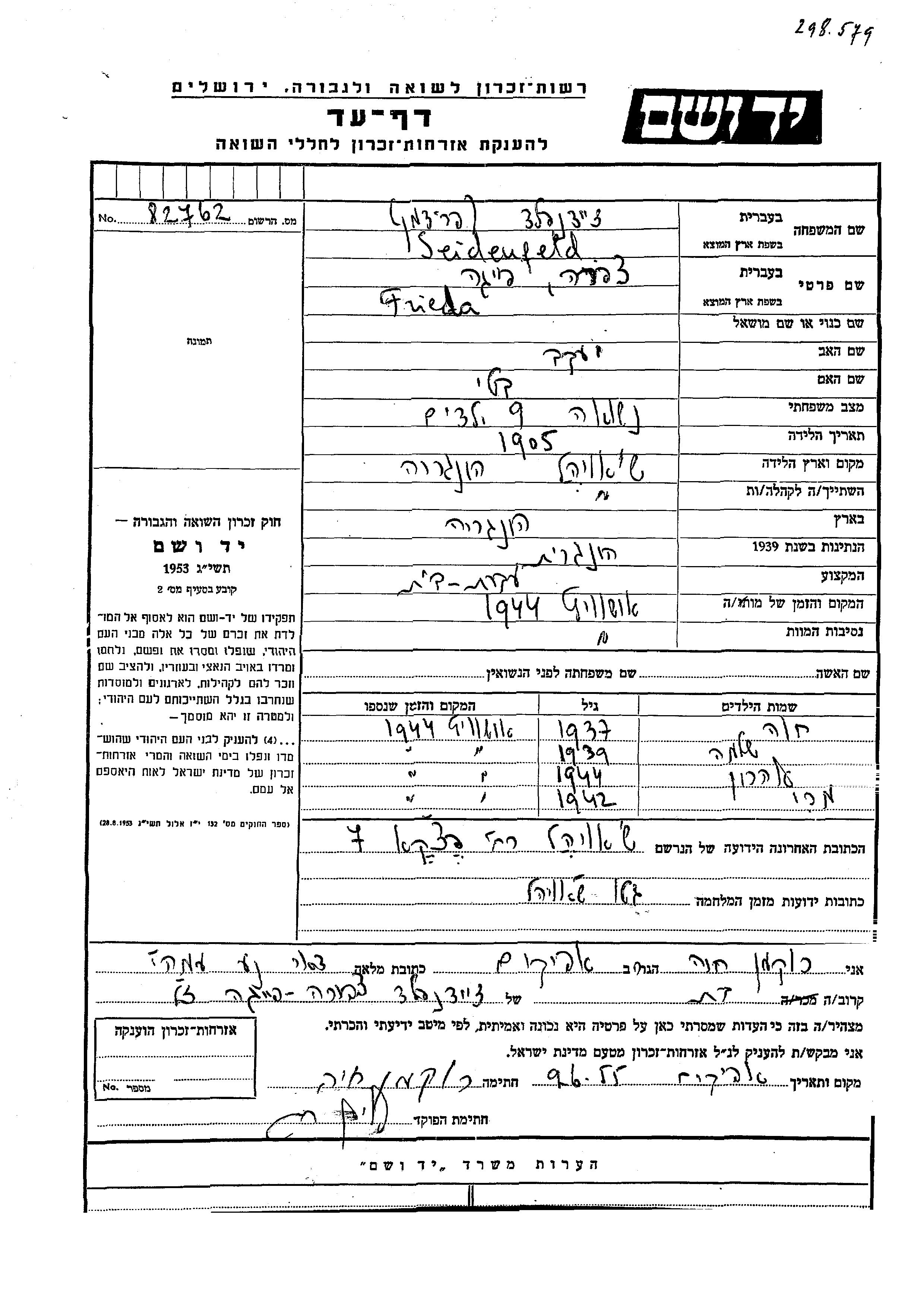 Seidenfeld Frieda Tzipora Feiga 1905 Satoraljaujhely, Hongrie Feuille de témoignage