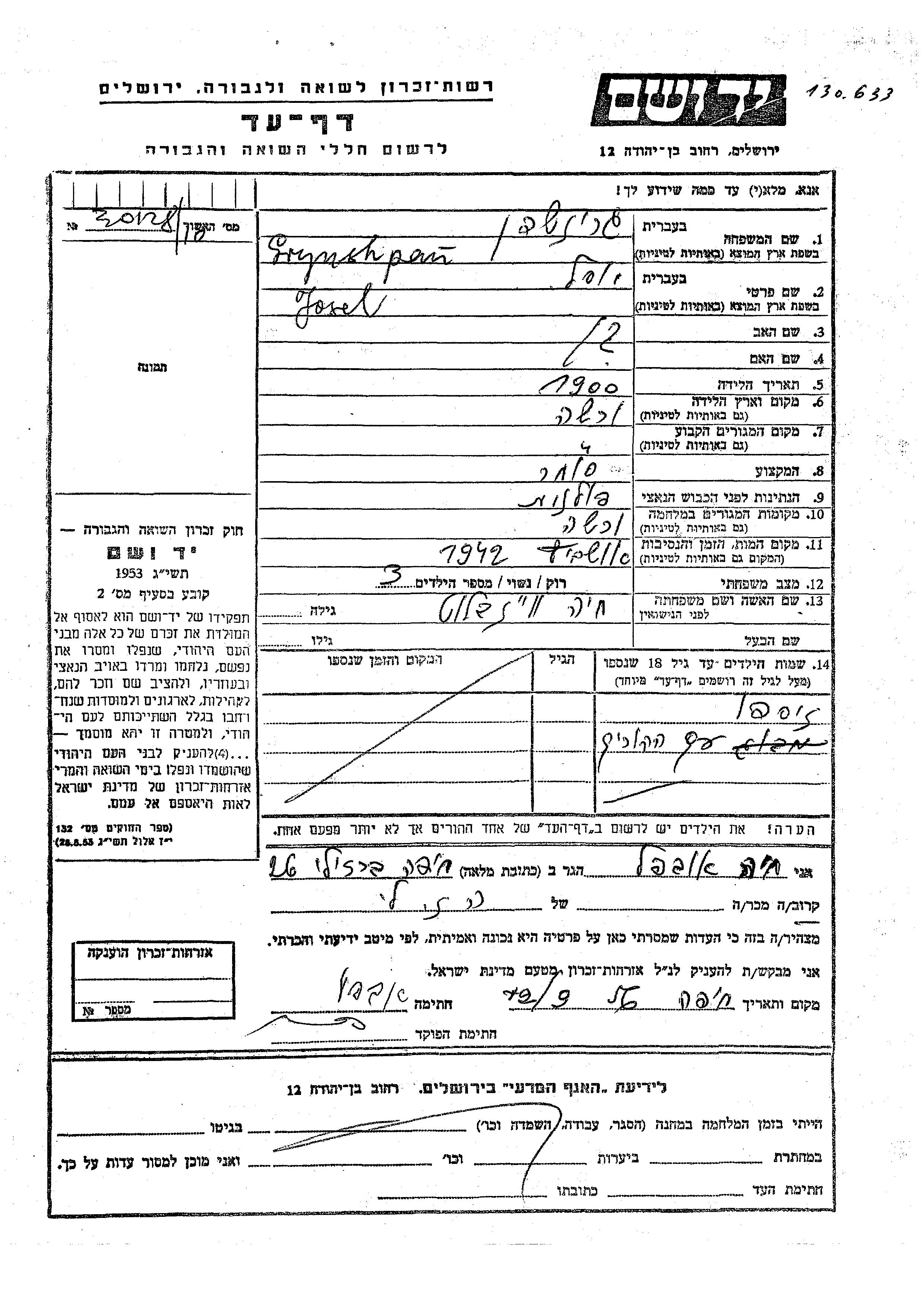 Grynshpan Yosel 1900 Warsaw, Pologne Feuille de témoignage