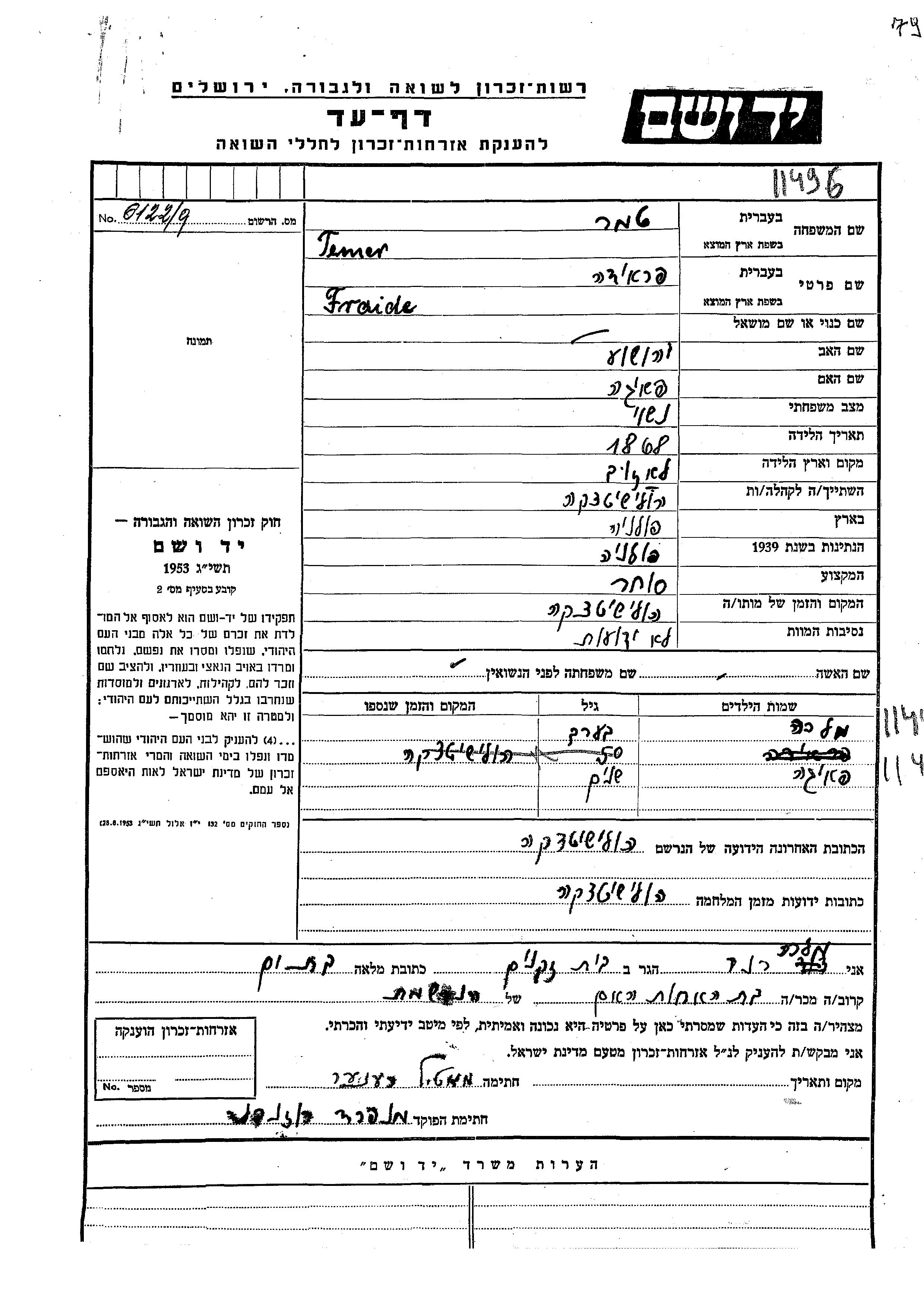 Temer Fraide Fraida 1868 endroit inconnu, Feuille de témoignage