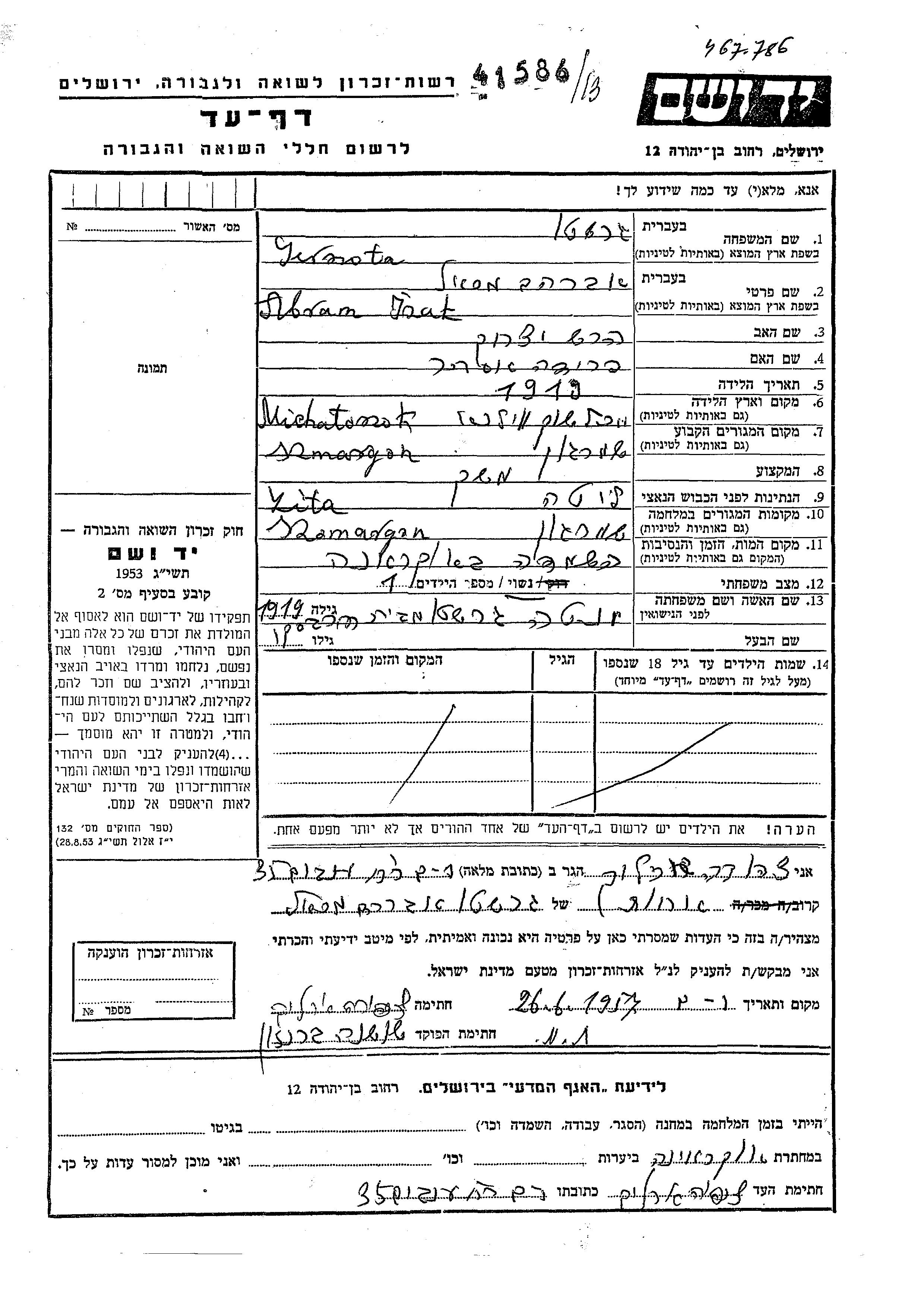 Gerszato Abram Izak Mekhael 1919 Szmargon, Pologne Feuille de témoignage