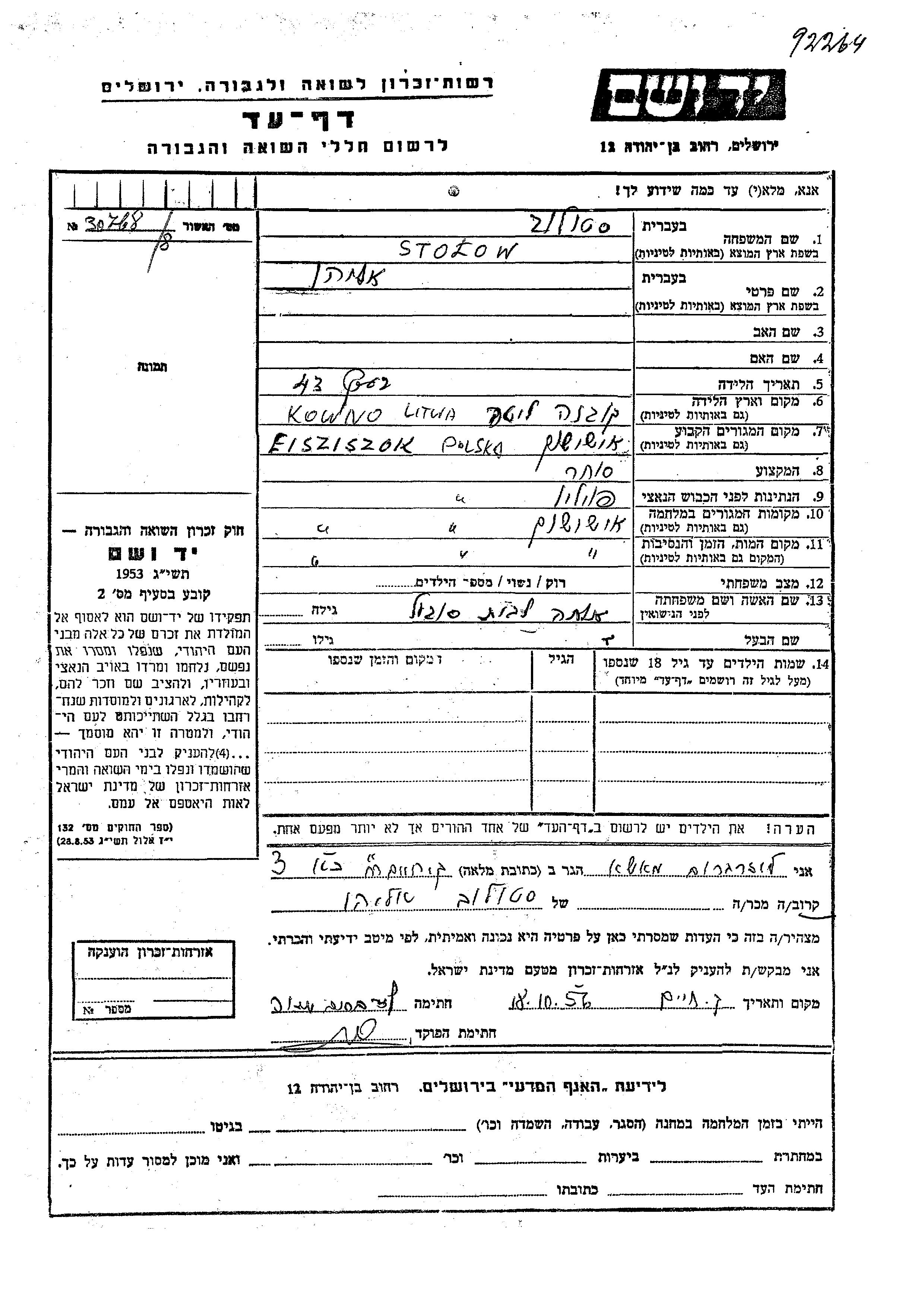 Stolow Eliahu Eisziszok, Pologne Feuille de témoignage