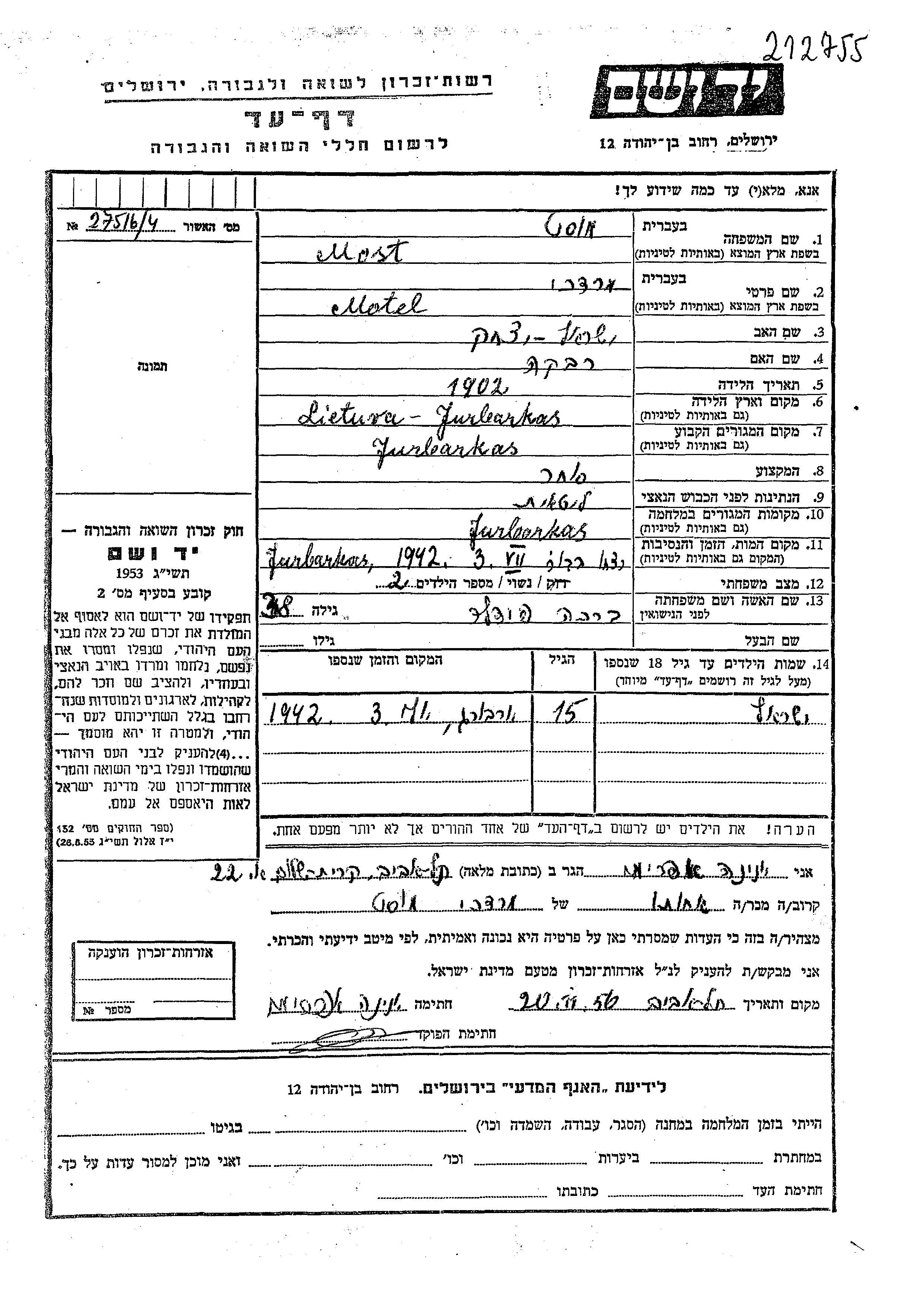 Motel a été assassiné pendant la Shoah. Lieu de la mort: endroit inconnu en 02/07/1942.