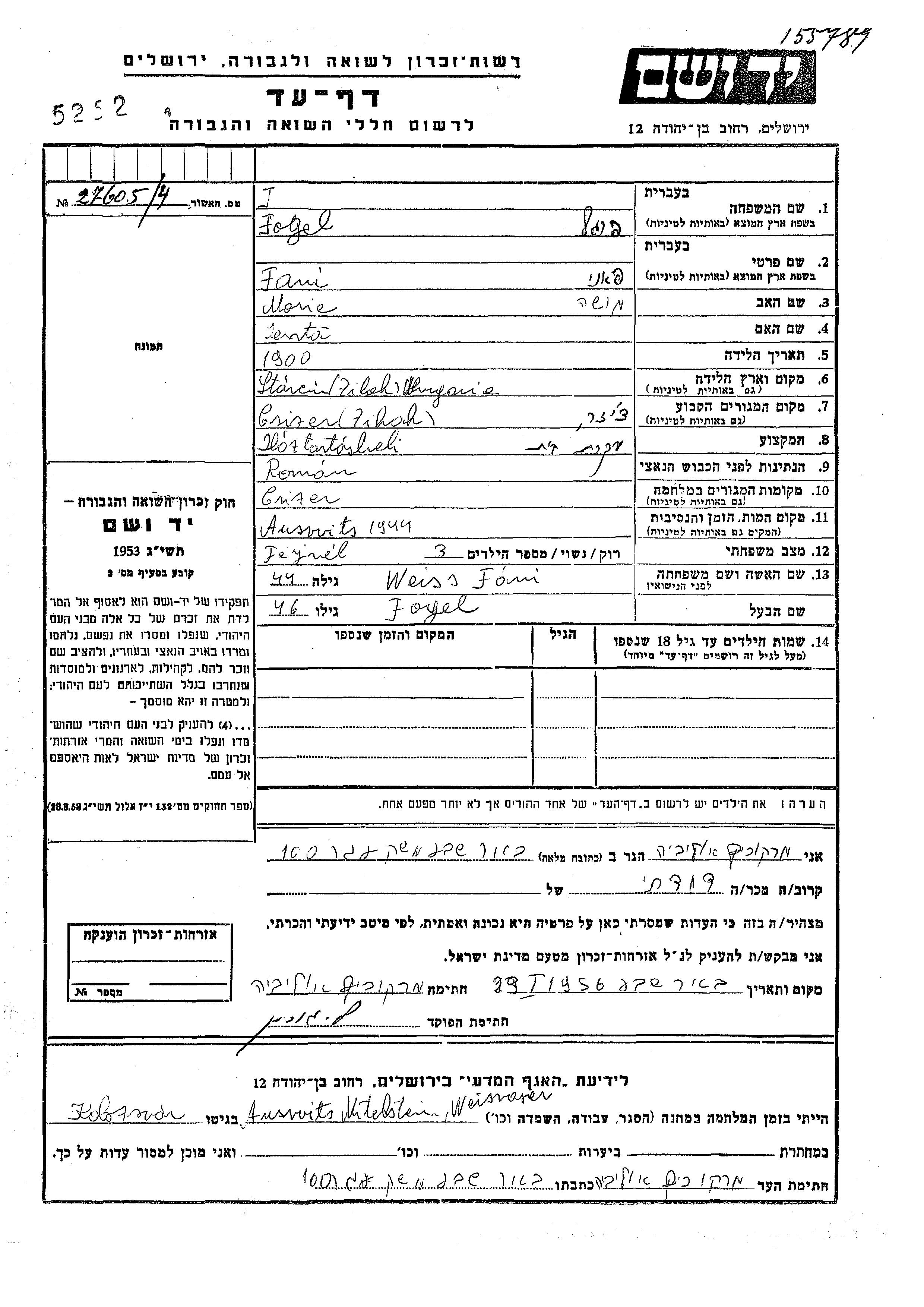 Fani Fogel née Weiss est née en 1900, fille de Mosie Misha et de Yenta. Elle était Femme au foyer et Mariée. Avant la seconde guerre mondiale elle vivait à Csizer, Roumanie. Pendant la guerre, elle était à Csizer, Roumanie.