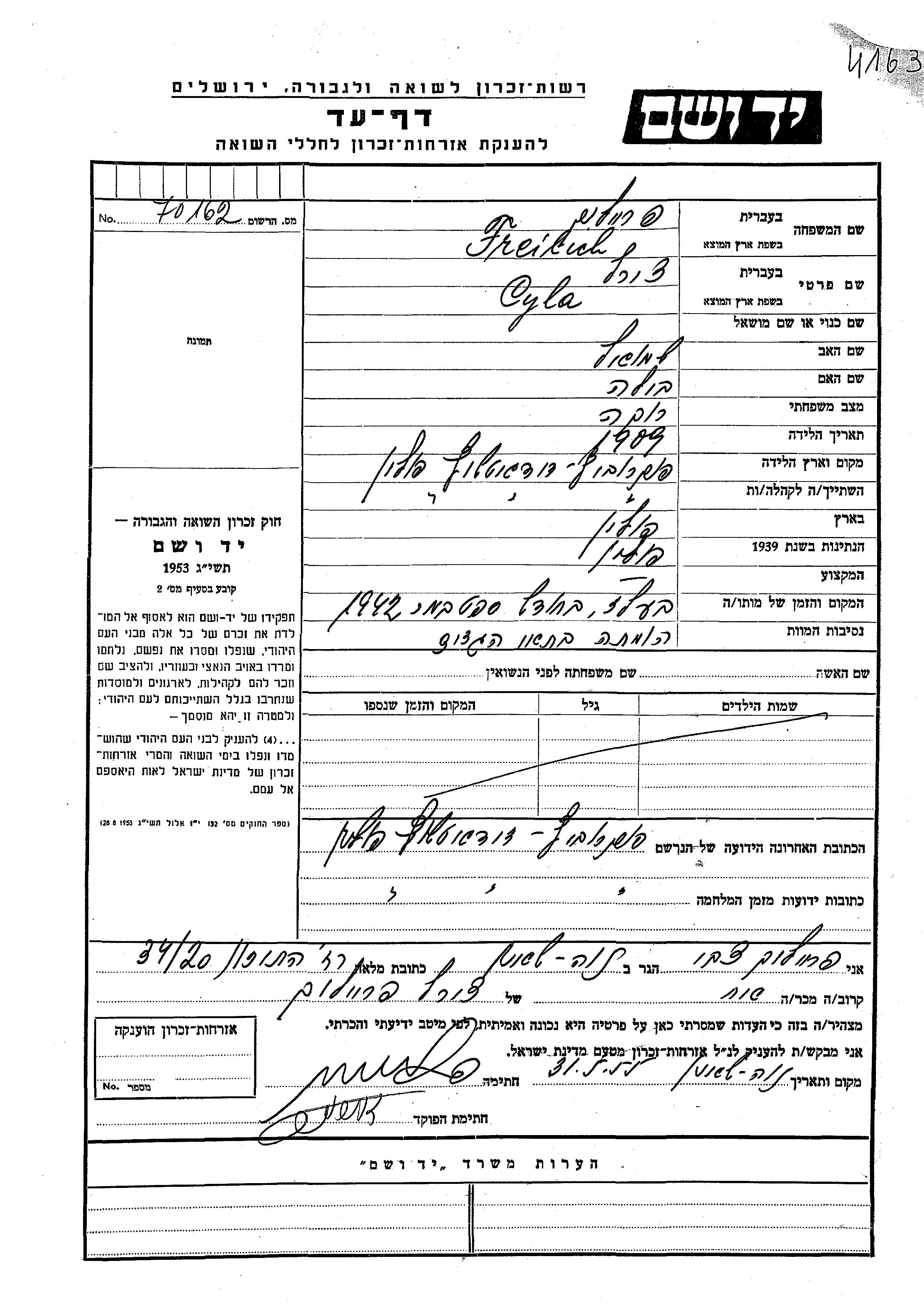 Freilich Cyla Tzirel 1909 Pokrowce, Pologne Feuille de témoignage