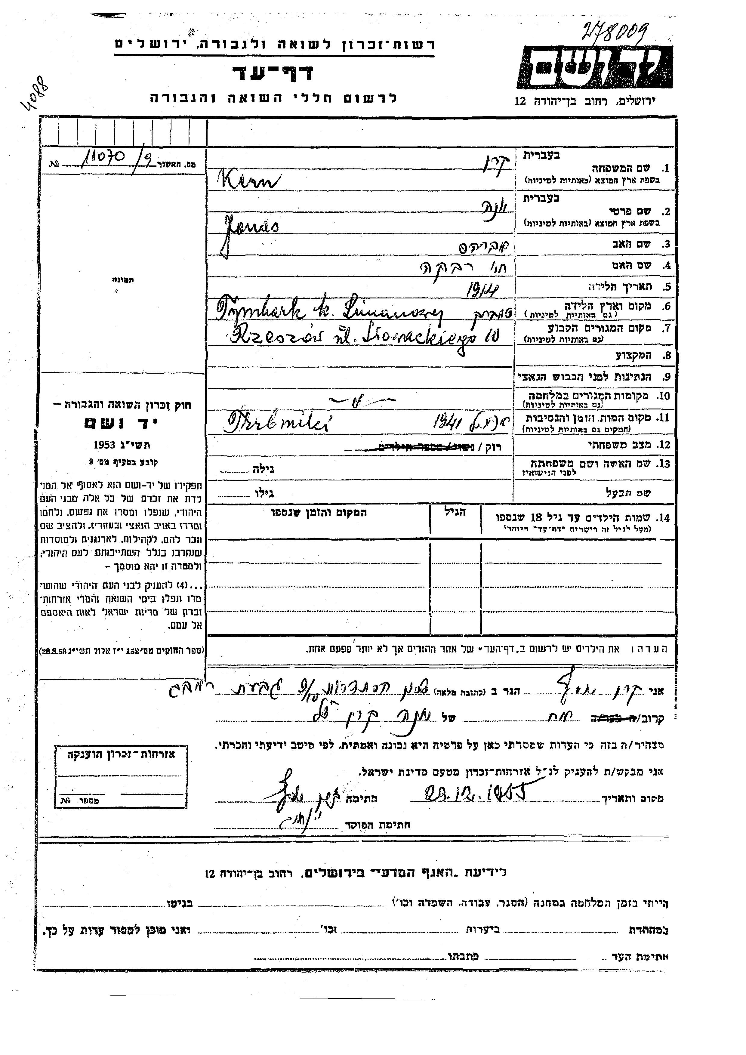 Kern Jonas 1914 Rzeszow, Pologne Feuille de témoignage