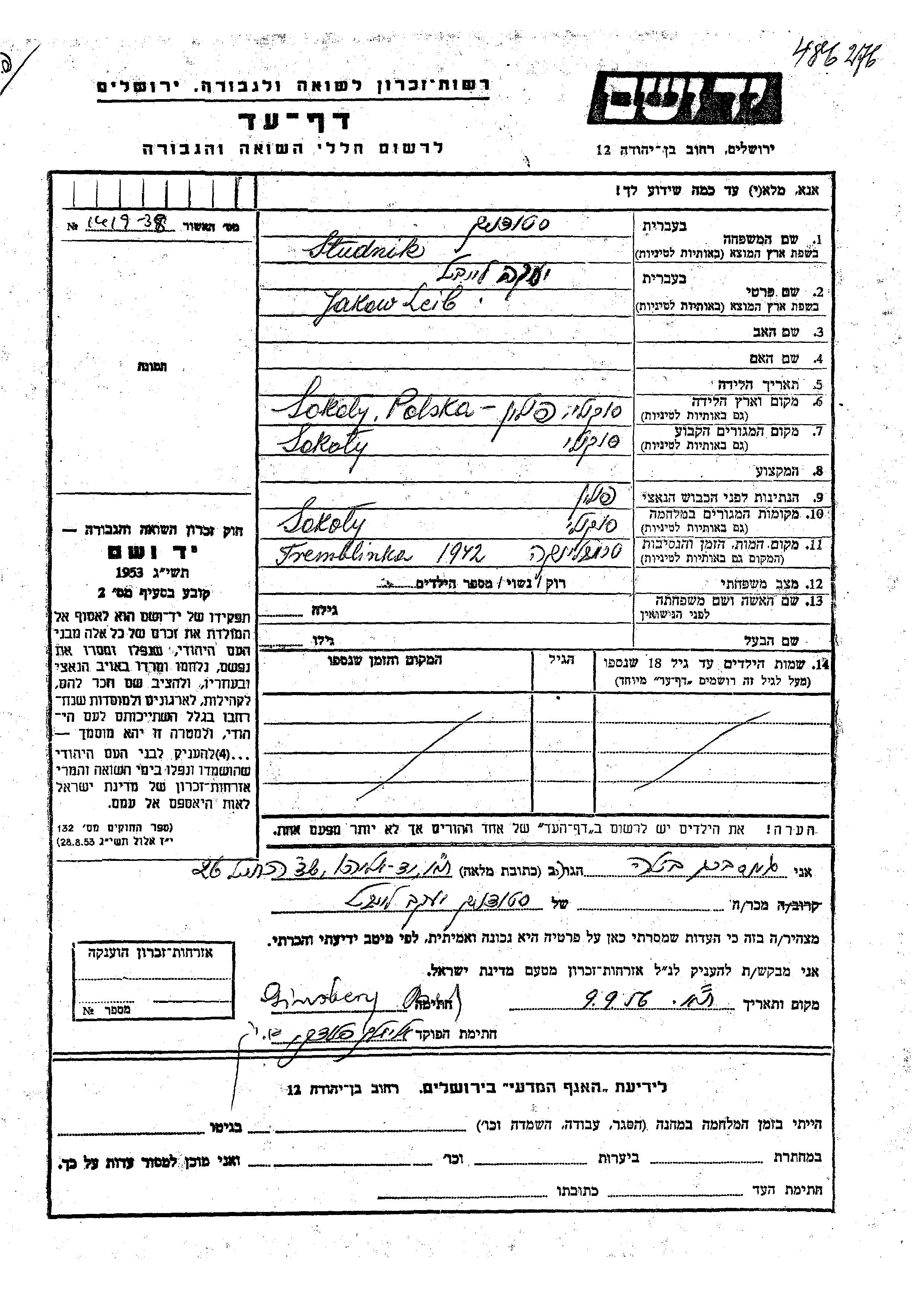 Studnik Jakow Leibel Sokoly, Pologne Feuille de témoignage