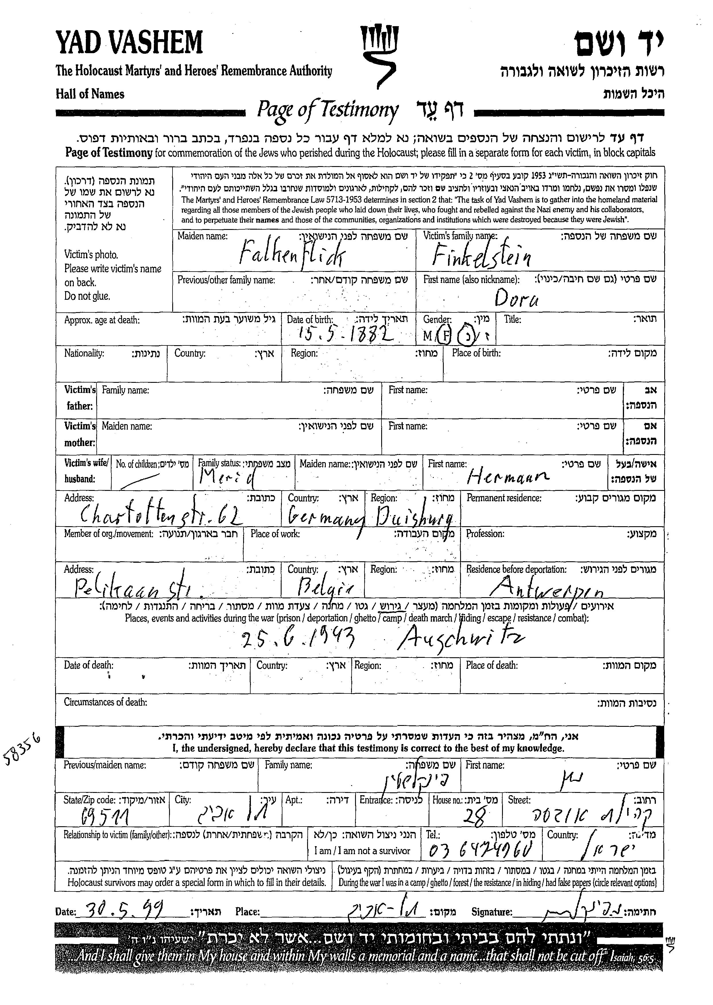 Finkelstein Dora 1882 Duisburg, Allemagne Feuille de témoignage