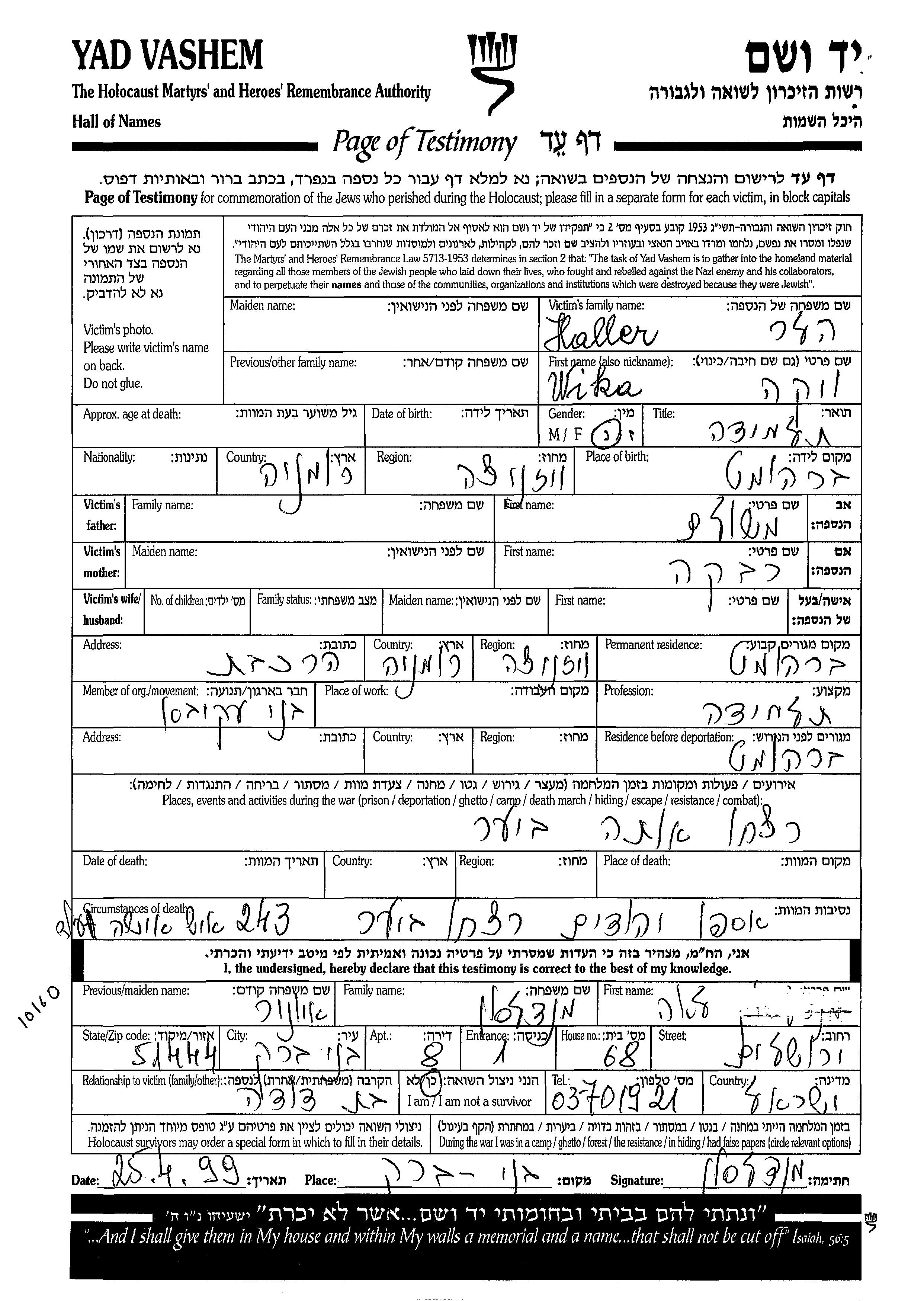 Yad Vashem - Pages of Testimony Names Memorial Collection