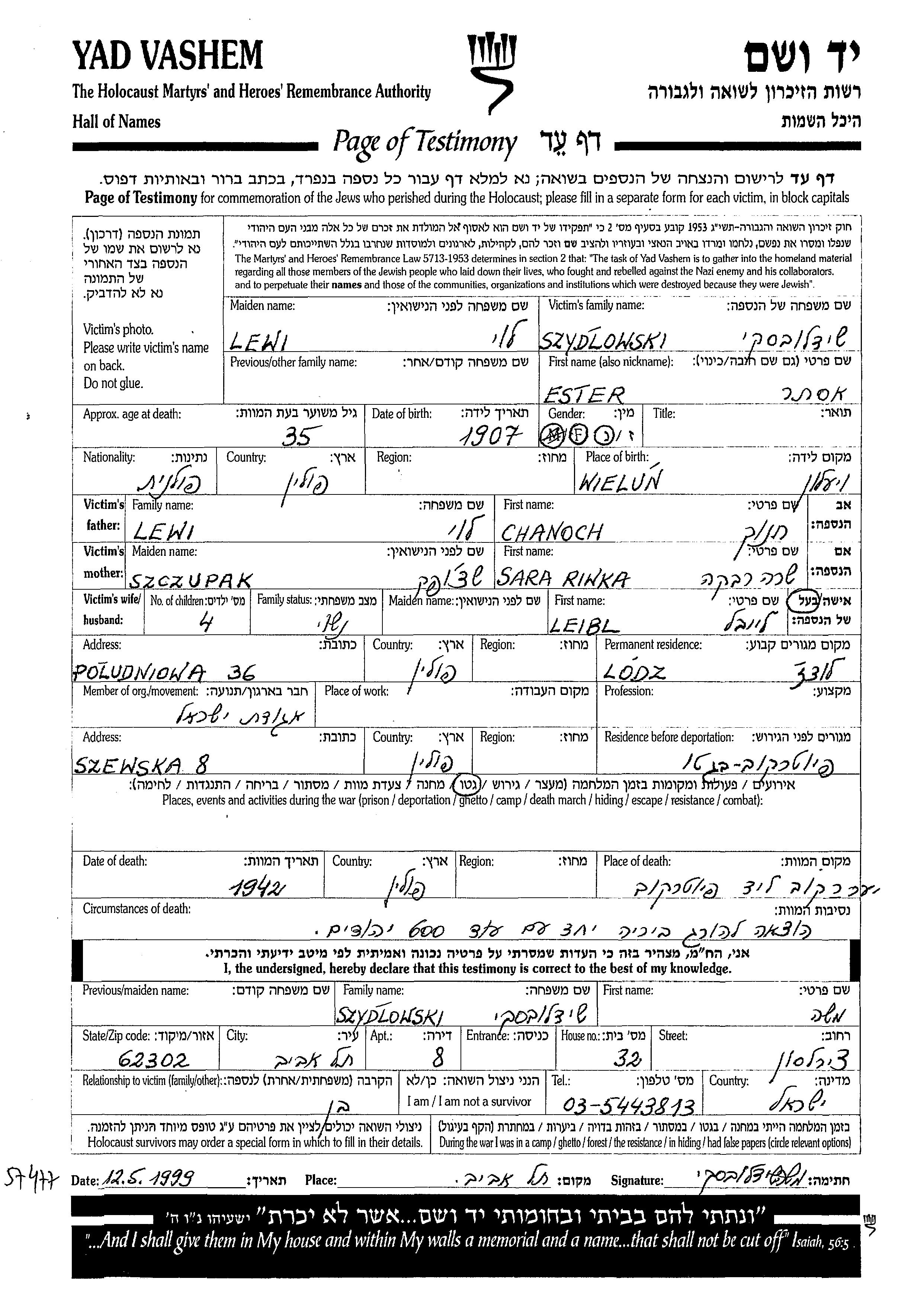 Szydlowski Ester 1907 Lodz, Pologne Feuille de témoignage