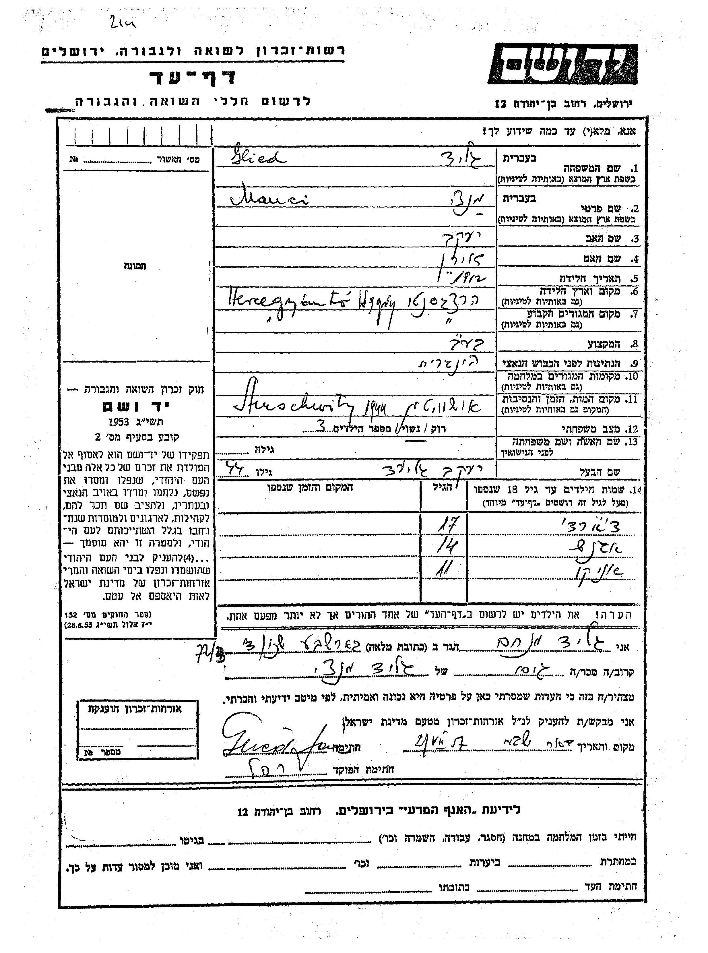 Yad Vashem - Pages of Testimony Names Memorial Collection