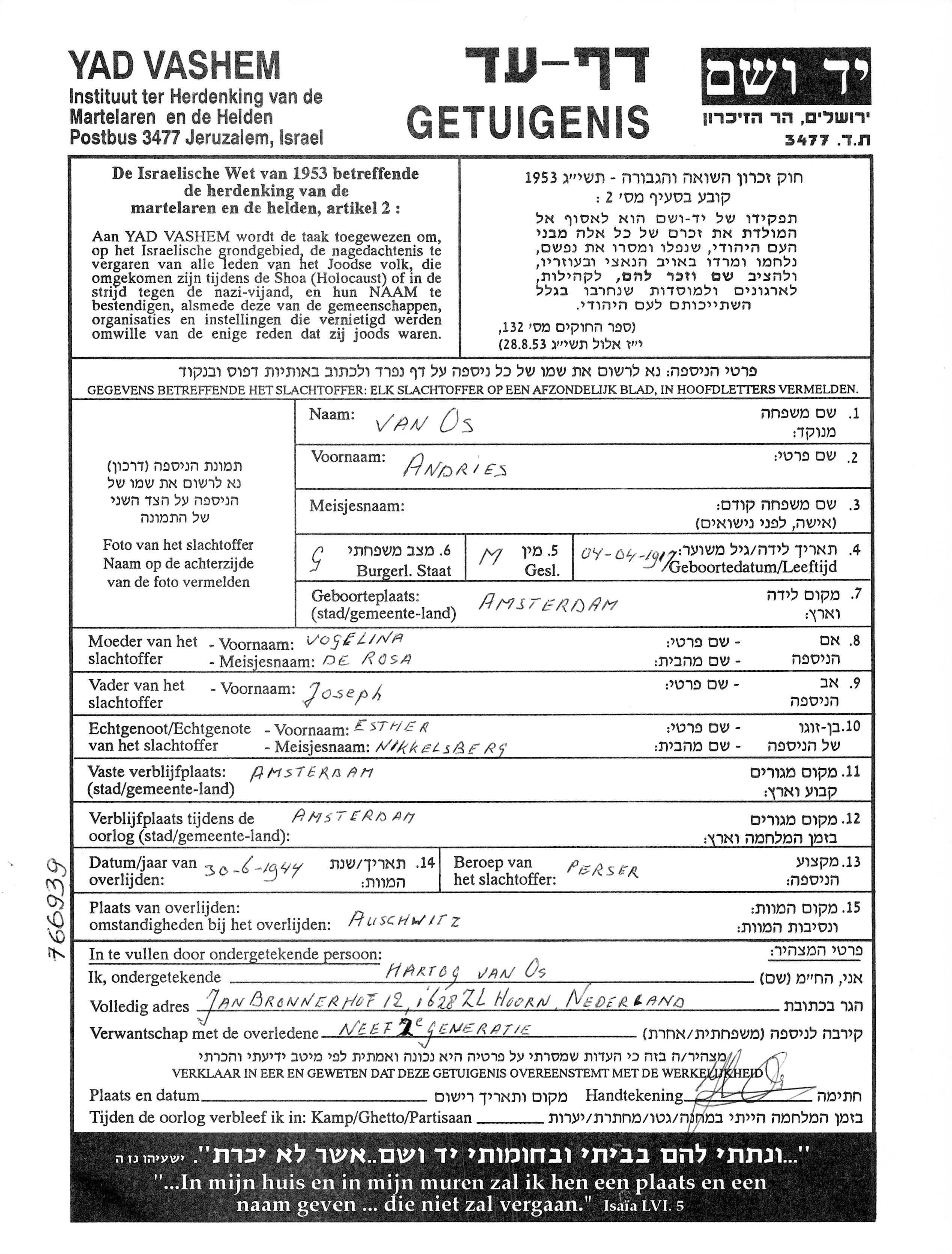 van Os Andries 1917 Amsterdam, Pays-Bas Feuille de témoignage