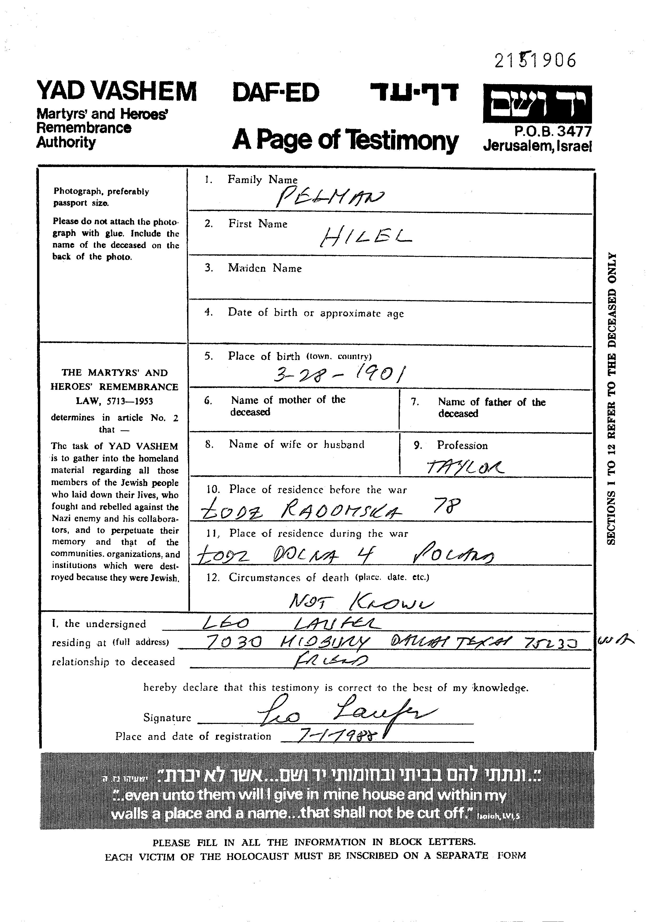 Pelman Felman Hilel 1901 Lodz, Pologne Feuille de témoignage