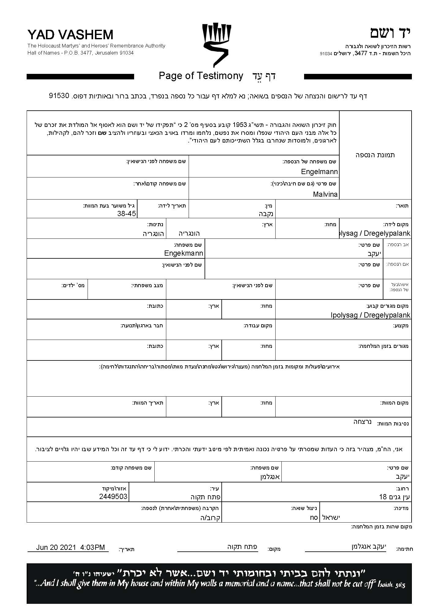 Engelmann | Malvina | Dregelypalank, Hongrie | Feuille de témoignage (digitale) | |