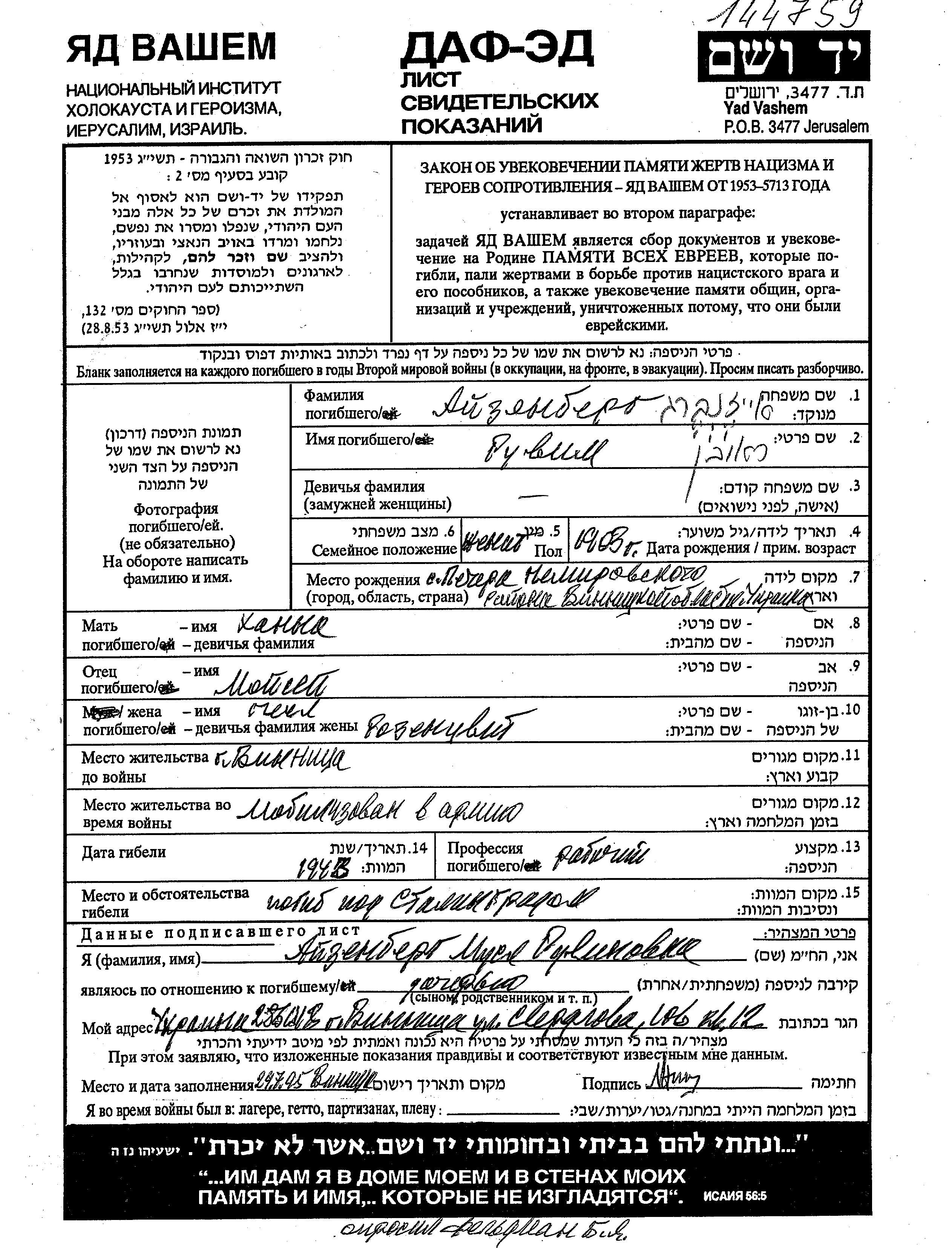 Reuven Aizenberg est né à Pechera, Ukraine (URSS) en 1903. Il était Ouvrier/e. Avant la seconde guerre mondiale il vivait à Vinnitsa, Ukraine (URSS). Reuven a été tué en tant que militaire pendant la Seconde Guerre mondiale. Lieu de la mort: Stalingrad, Russie (URSS).