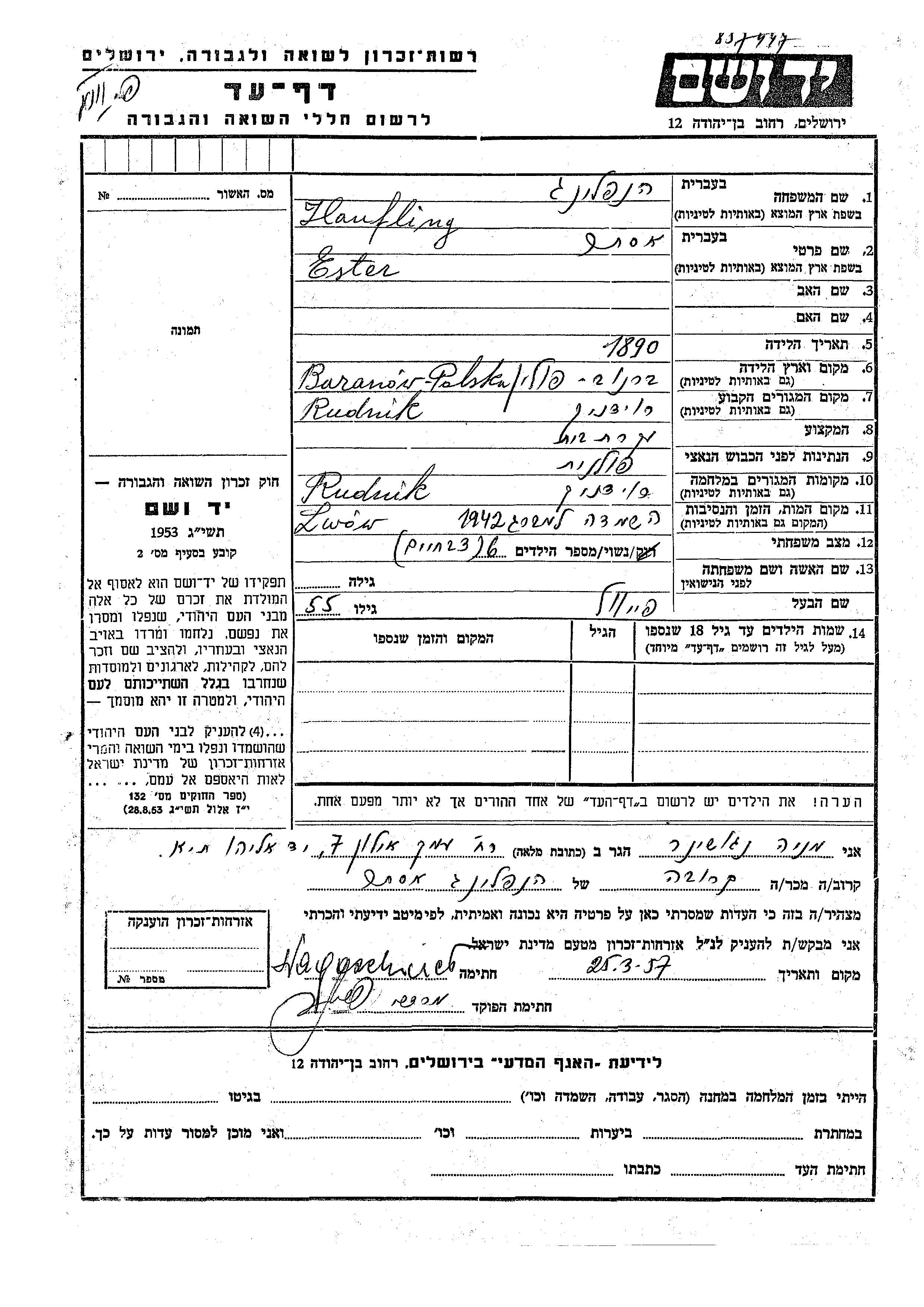 Hanfling Esther 1890 Rudnik, Pologne Feuille de témoignage (digitale)