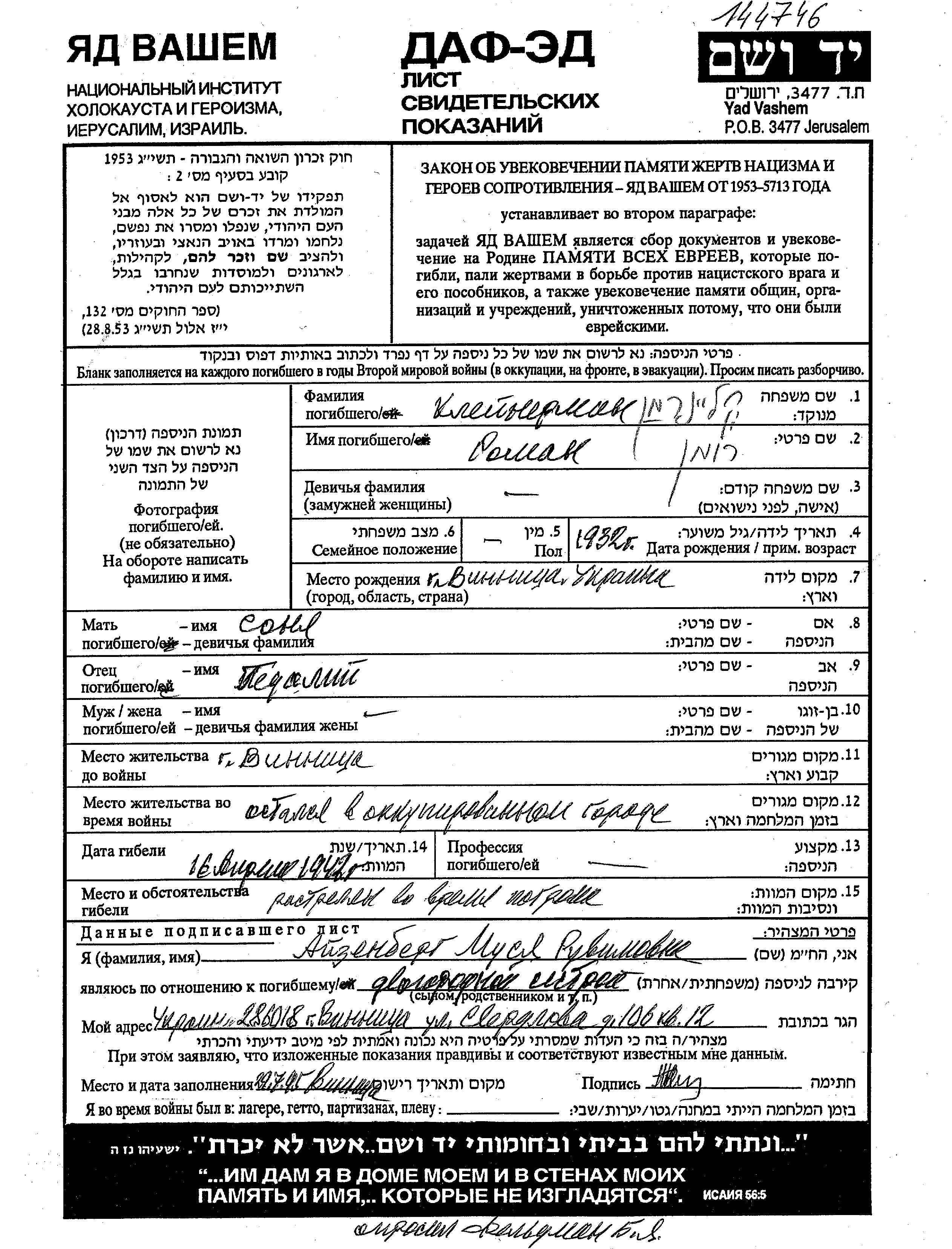 Kleinerman Roman 1932 Vinnitsa, Ukraine (URSS) Feuille de témoignage