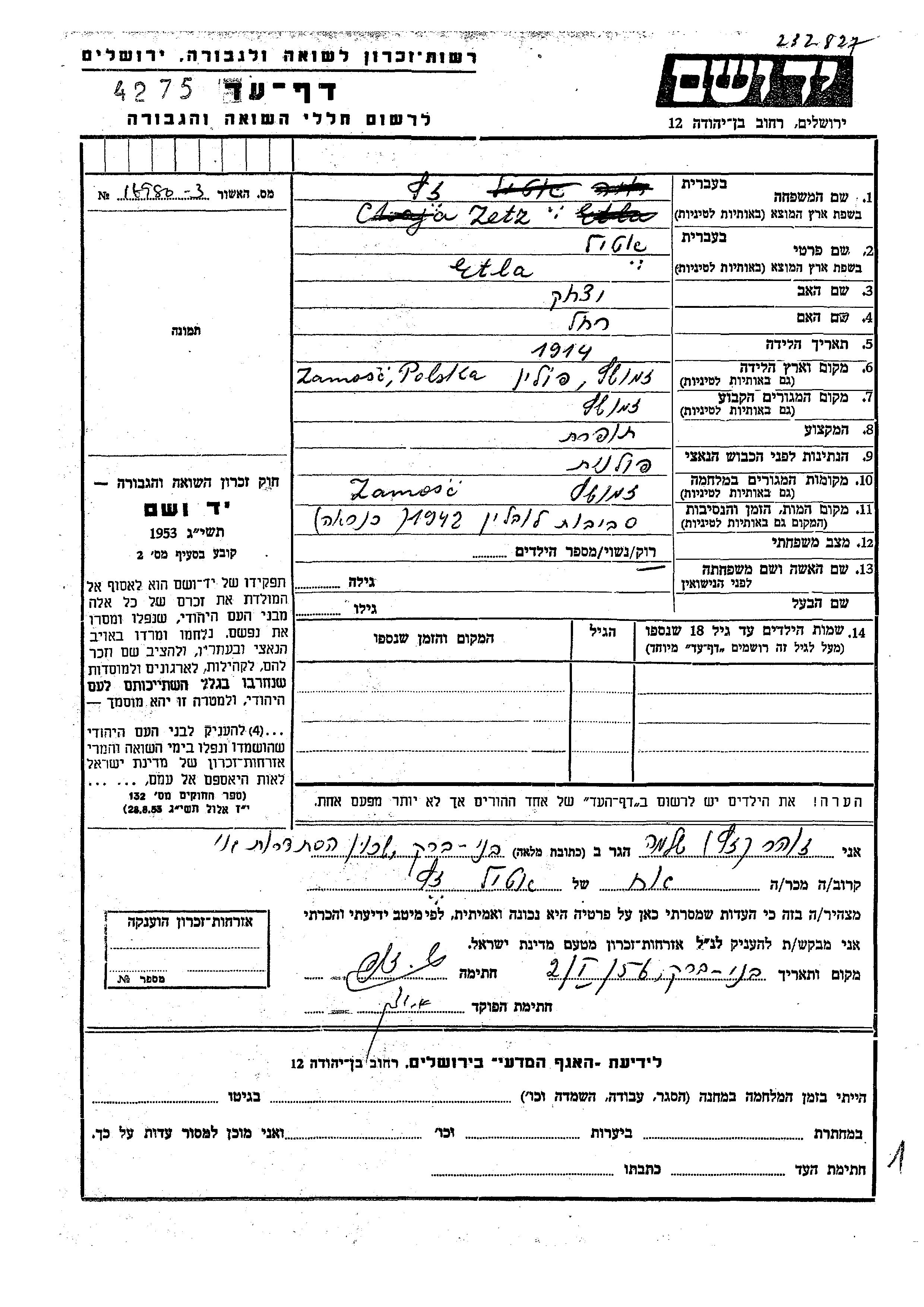 Zetz Etil 1914 Zamosc, Pologne Feuille de témoignage
