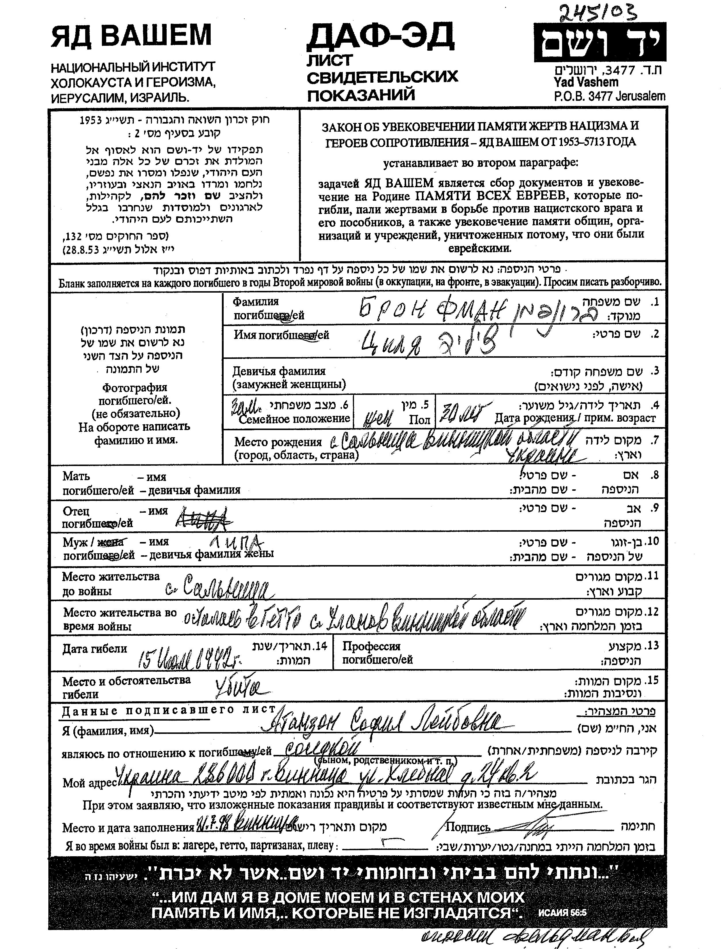 Yad Vashem - Pages of Testimony Names Memorial Collection