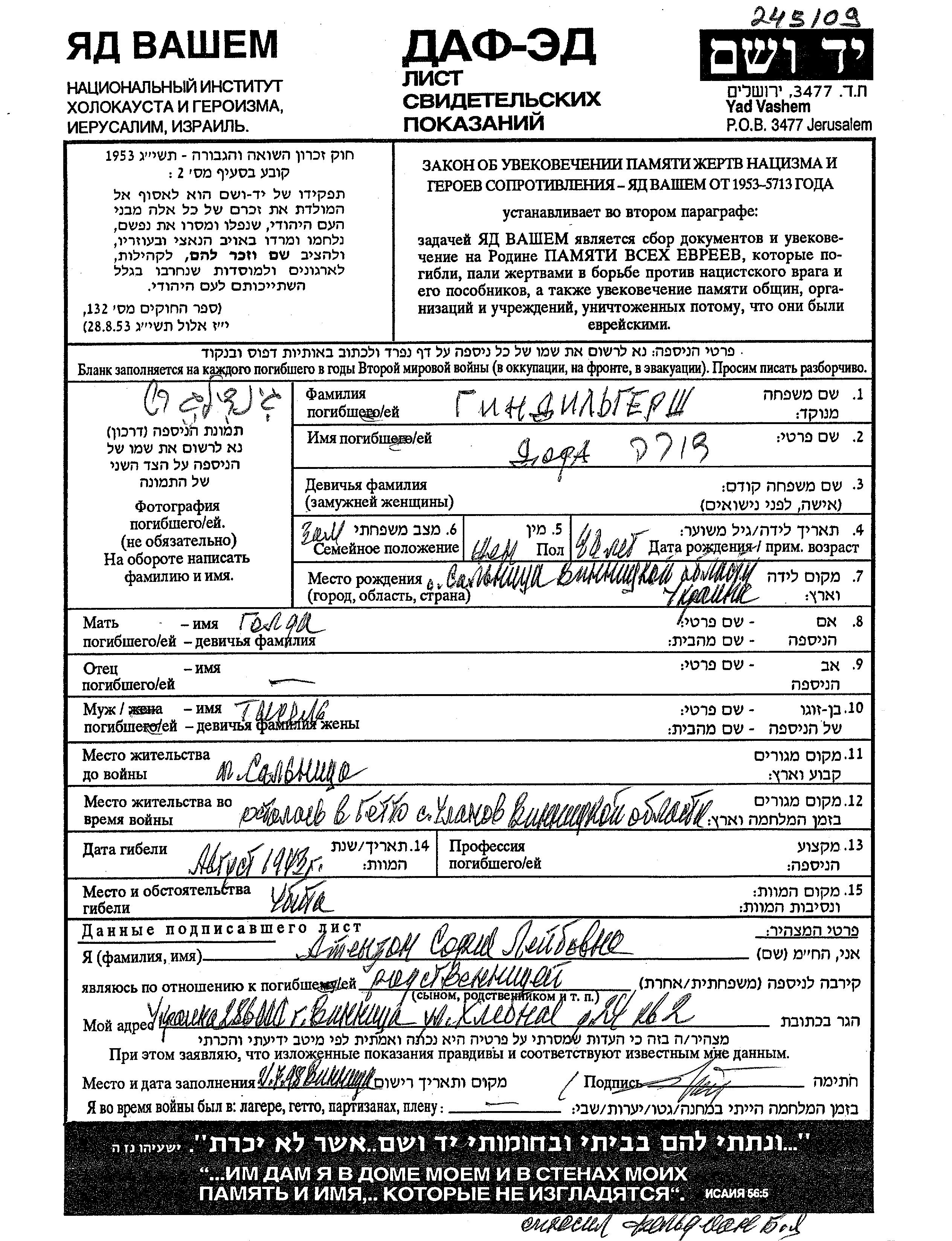 Gindilgersh | Dora | 1903 | Salnitsa, Ukraine (URSS) | Feuille de témoignage |