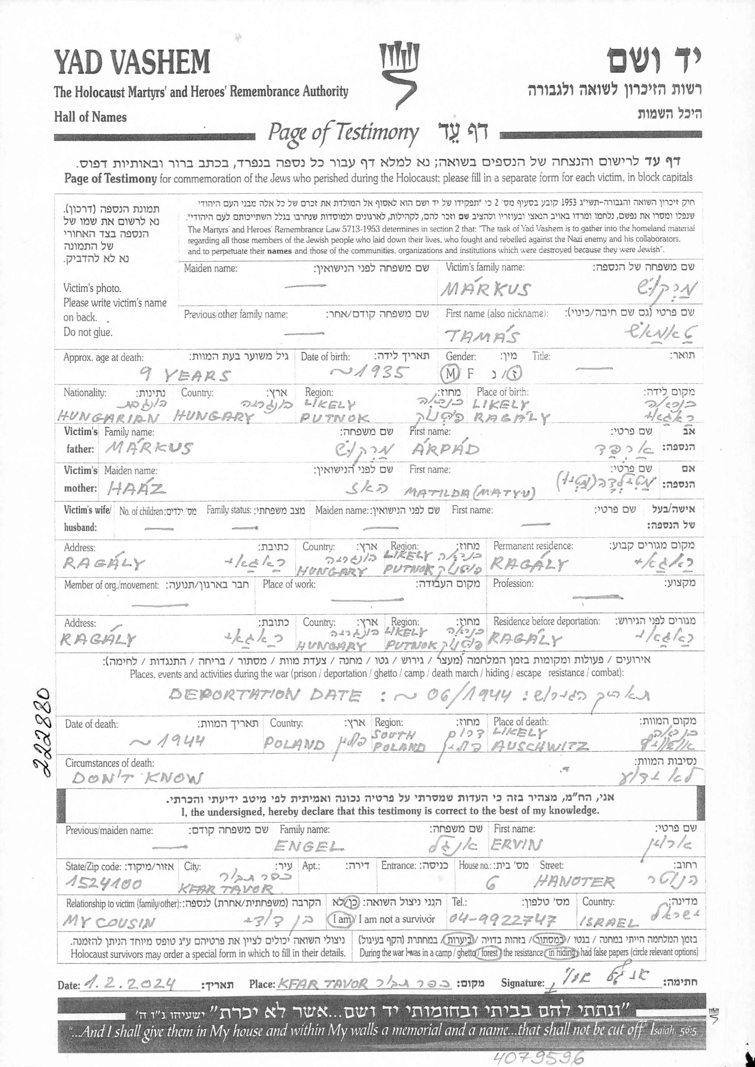 Markus | Tamás | 1935 | Ragaly, Hongrie | Feuille de témoignage |