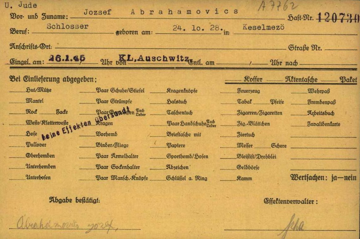 Abramovics Jozsef 1928 endroit inconnu, Fichier de ITS