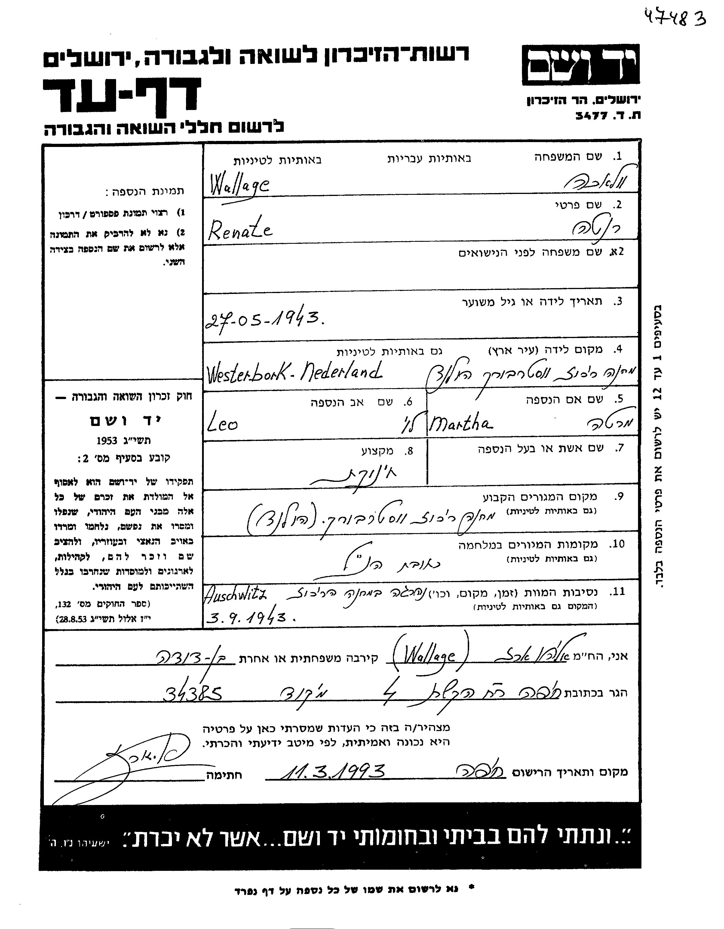 Wallage Renate 1943 Westerbork, Pays Bas Liste des Juifs des Pays-Bas assassinés