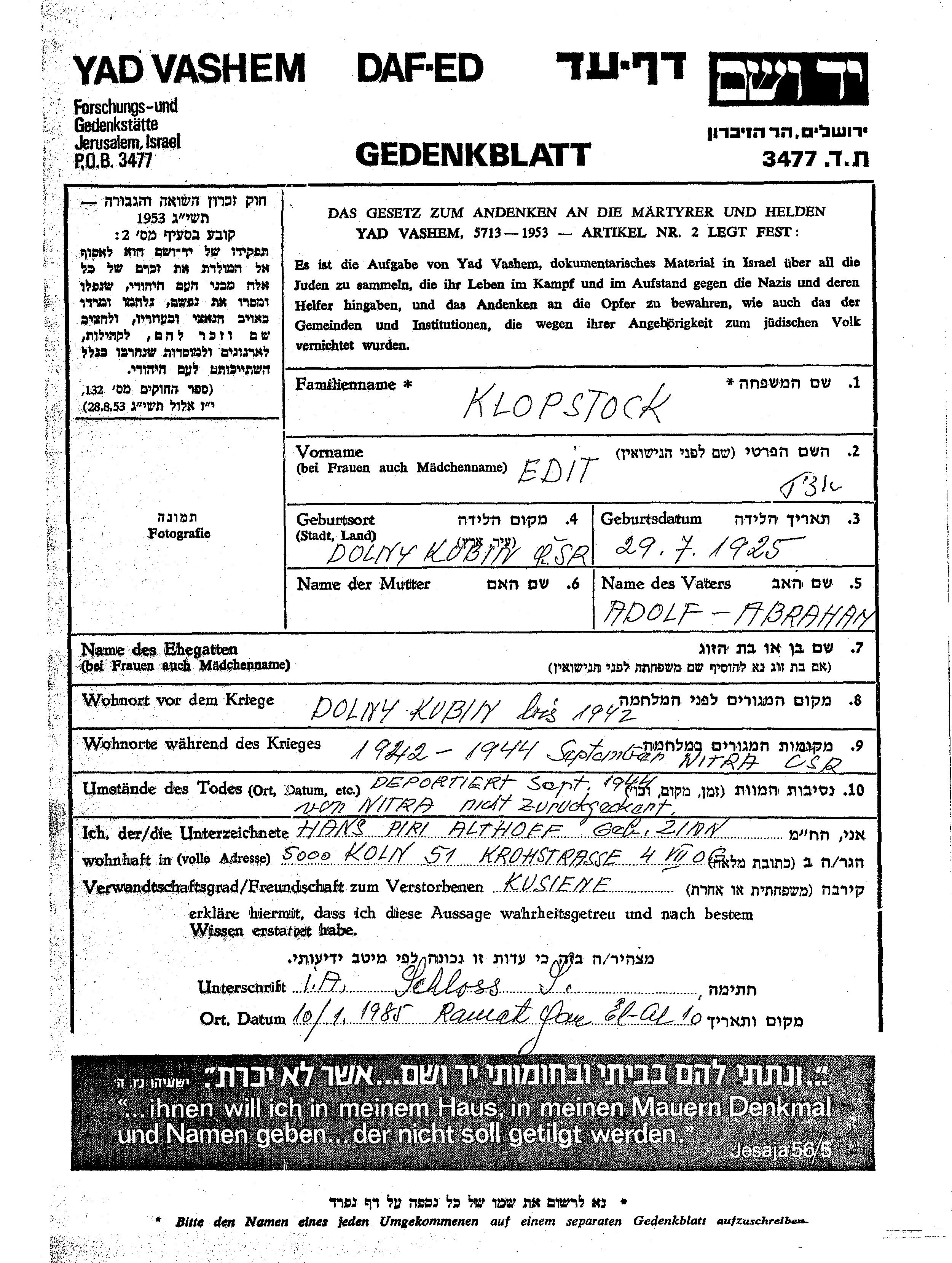 | Klopstock | Edita | 1925 | Liptovsky Svaty Mikulas, Tchécoslovaquie | Liste de personnes persécutées |
