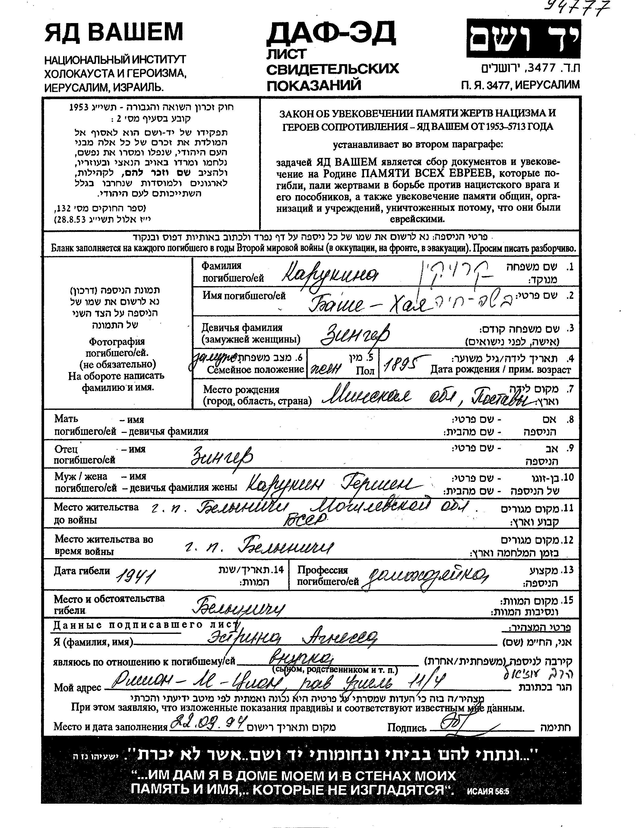 Karukin Bashe Khaia 1895 Belynichi, Bélorussie (URSS) Feuille de témoignage