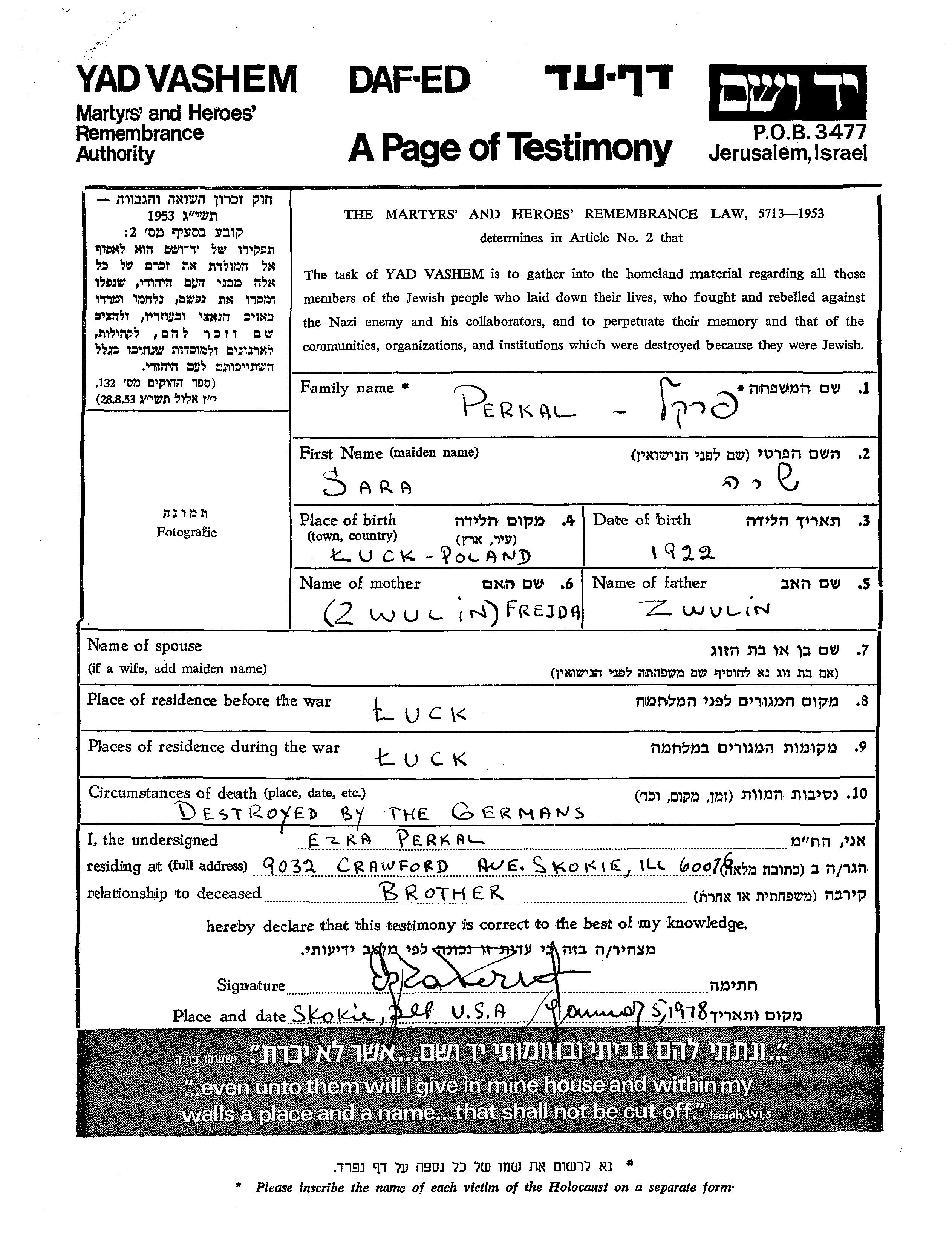 Sara Perkal est née à Luck, Pologne en 1922. Avant la seconde guerre mondiale elle vivait à Luck, Pologne.