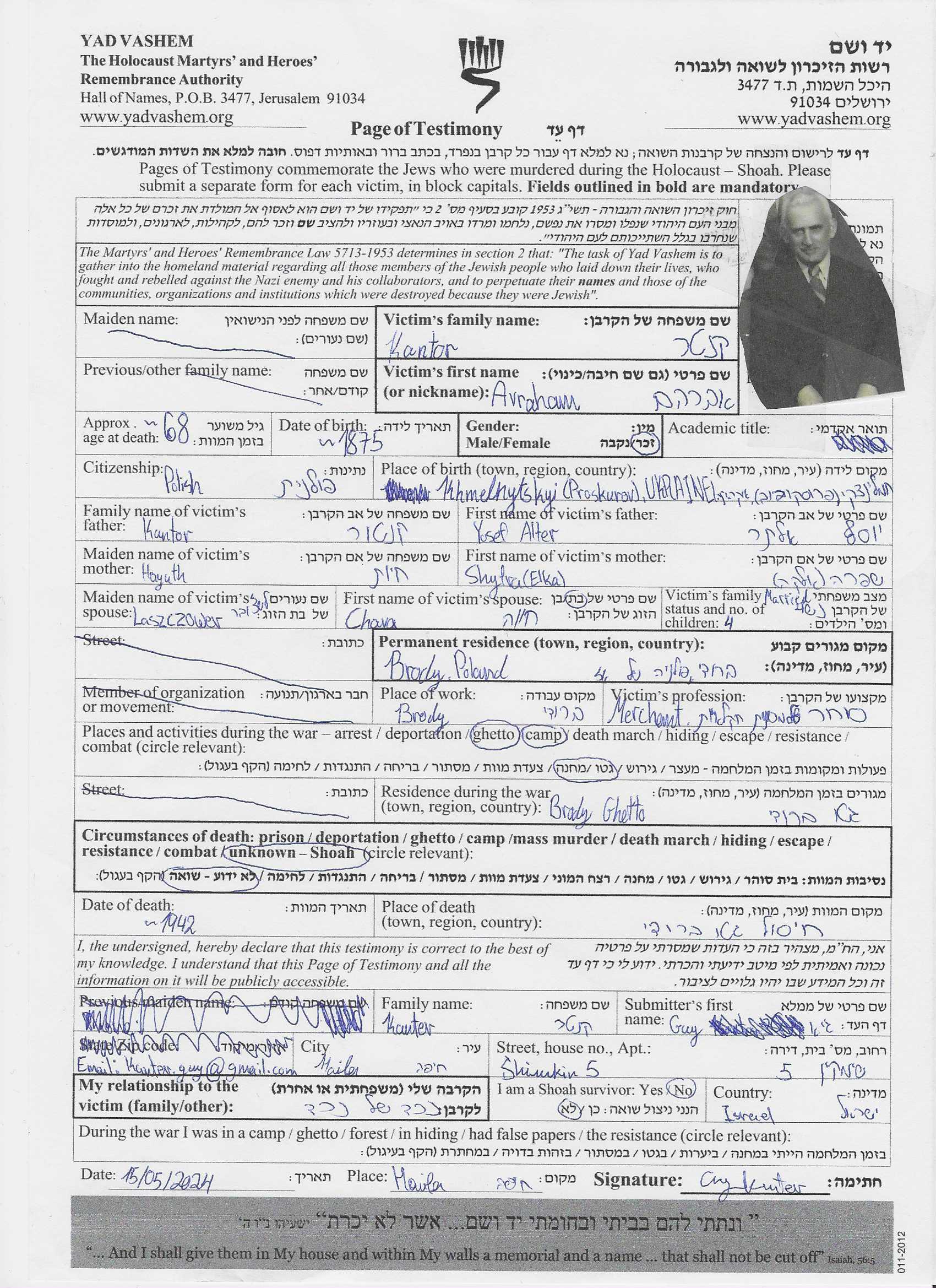 Avraham Kantor Kanter est né à Proskurow, Ukraine (URSS) en 1875. Il était Machine dealer. Avant la seconde guerre mondiale il vivait à Brody, Pologne.