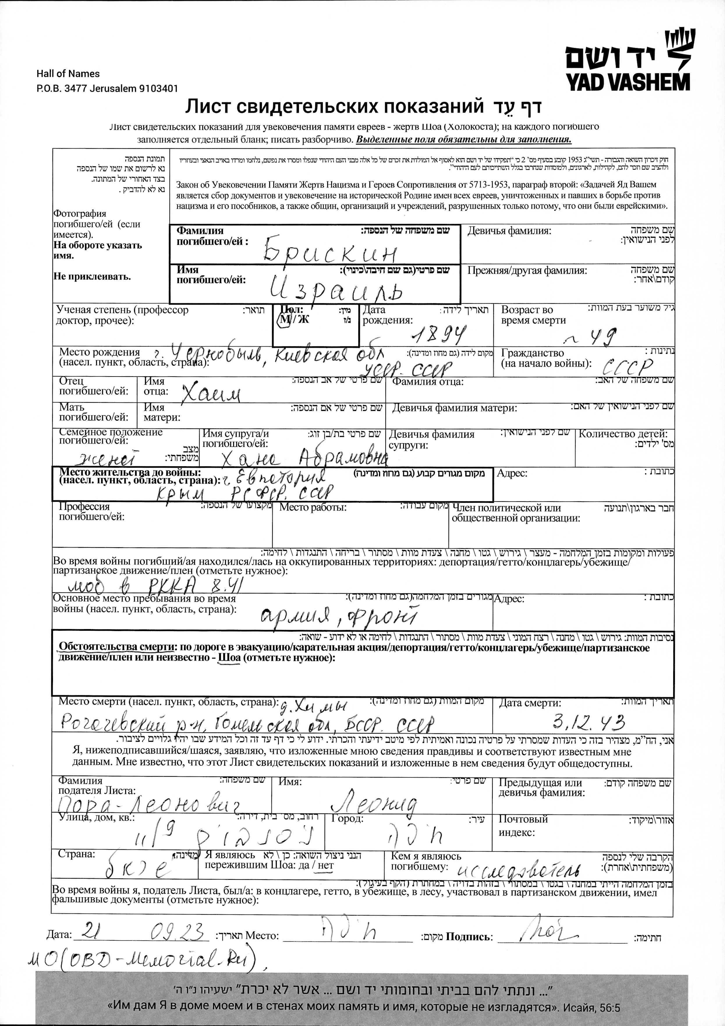 Briskin Izrail 1894 Yevpatoriya, Russie (URSS) Feuille de témoignage