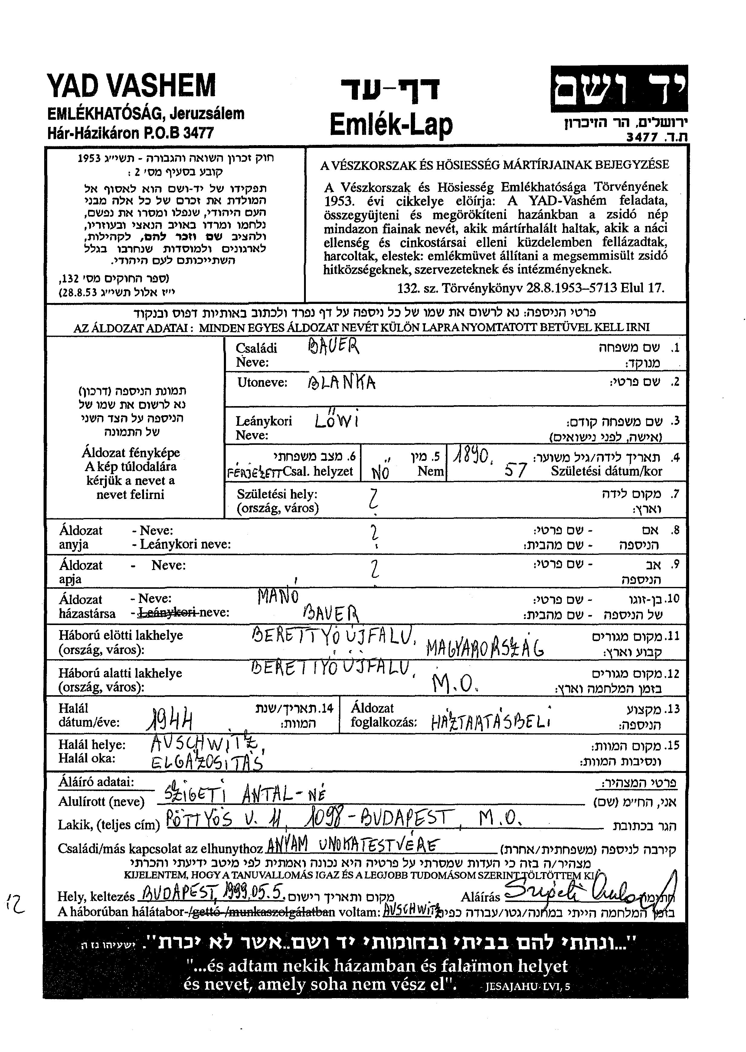 Blanka Bauer née Lowi est née à endroit inconnu en 1882. Elle était Femme au foyer. Avant la seconde guerre mondiale elle vivait à Told, Hongrie.
