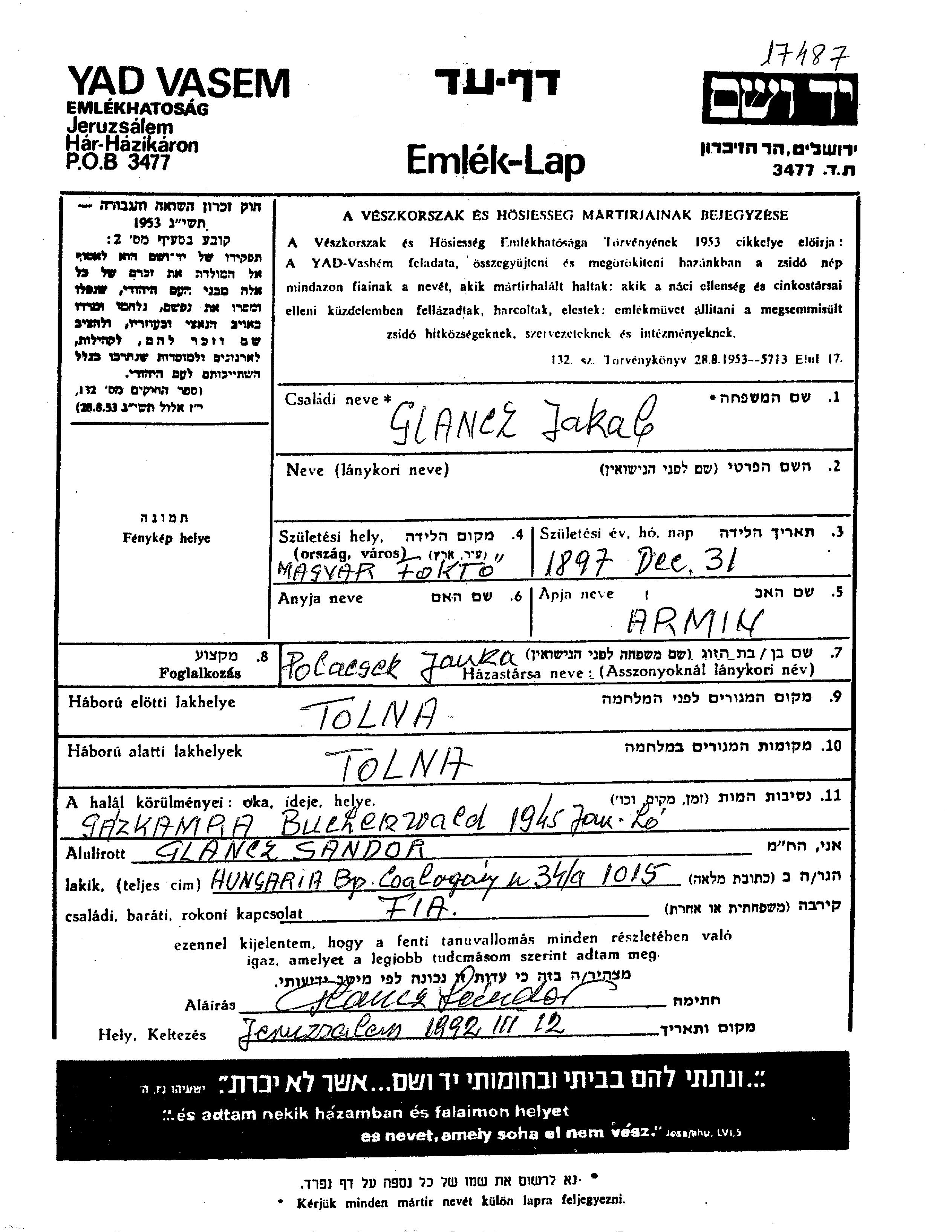 Glancz Jakab 1897 Tolna, Hongrie Feuille de témoignage