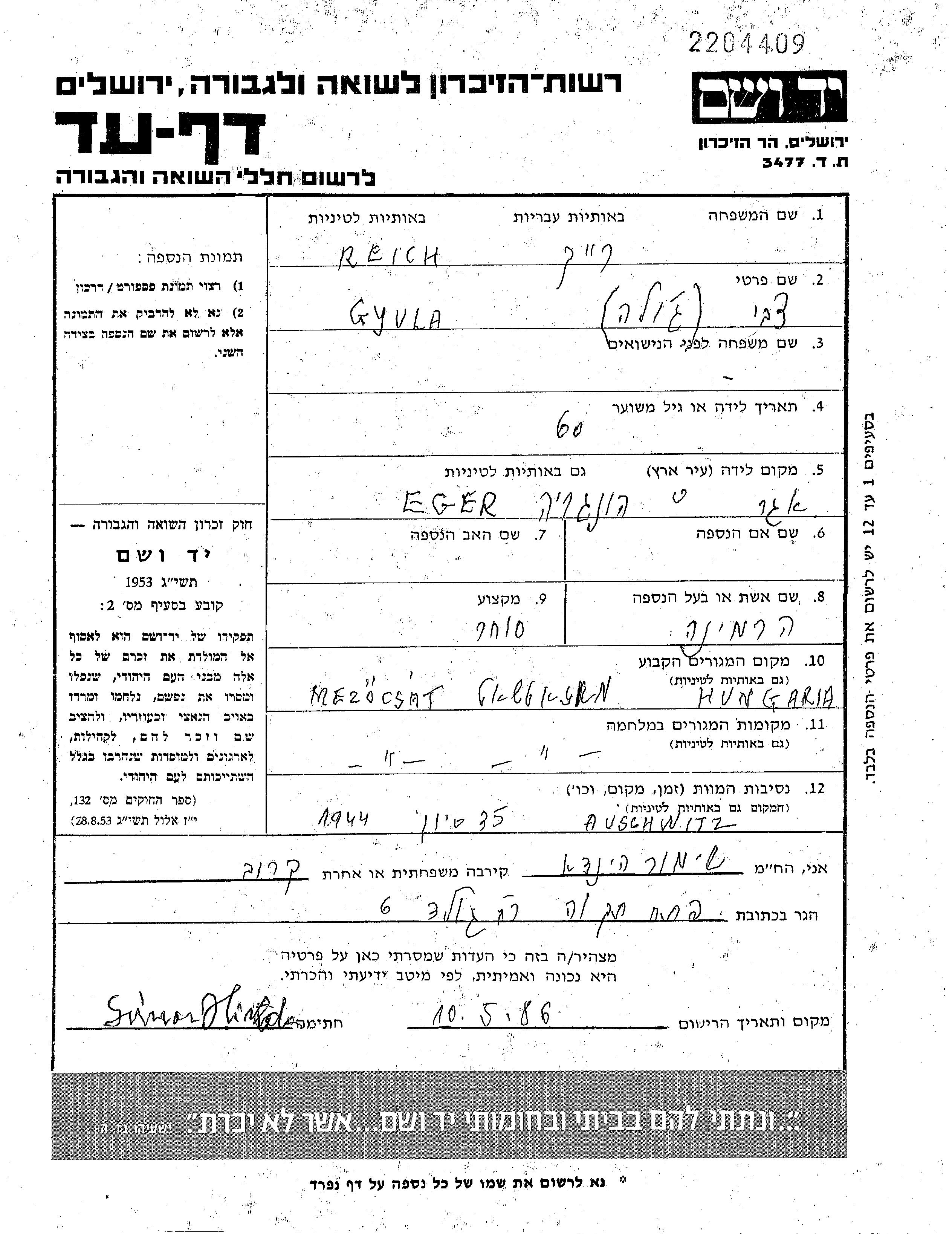 Reich | Gyula Tzvi | 1884 | Mezocsat, Hongrie | Feuille de témoignage |
